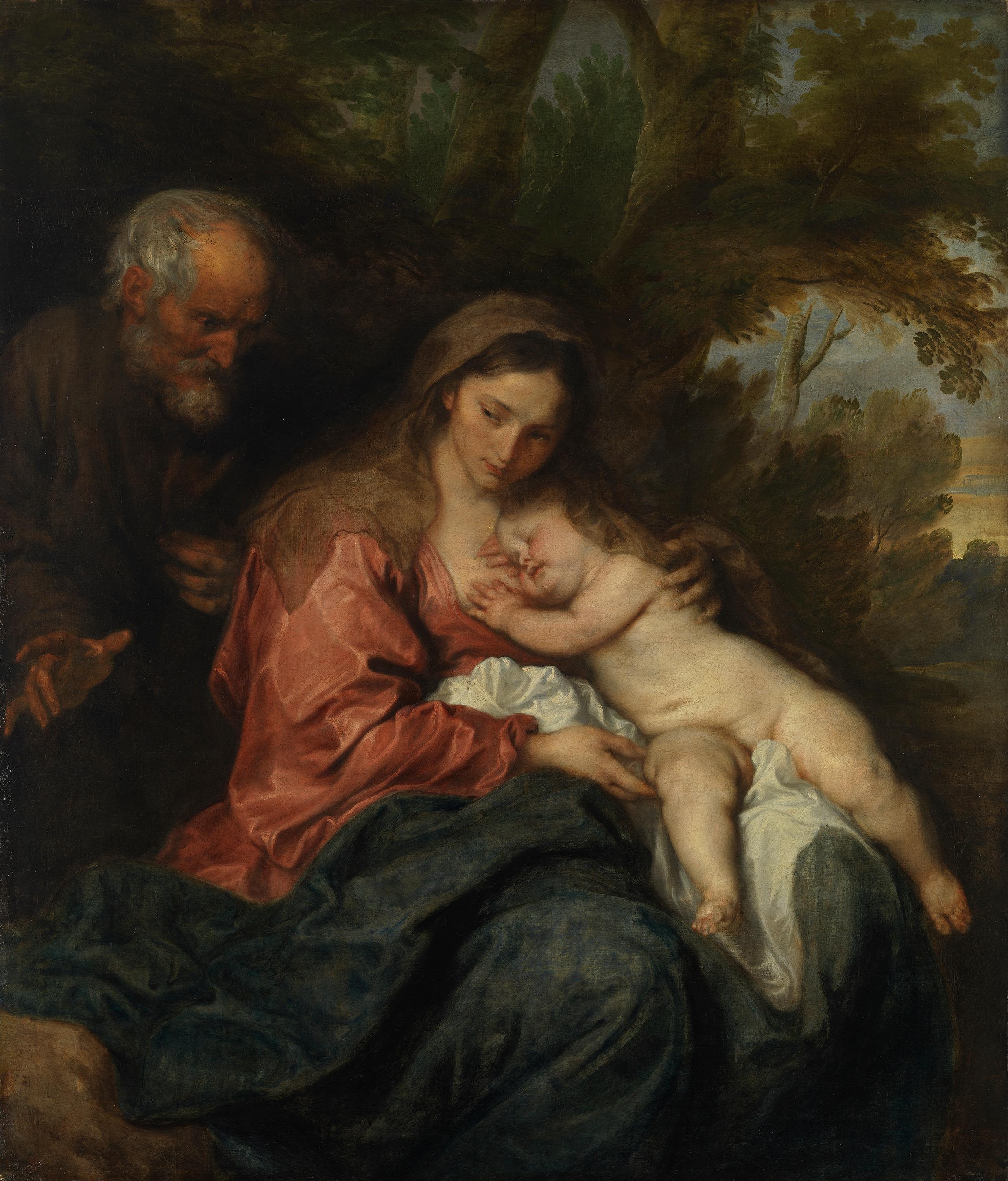 In Italien hatte van Dyck Tizians Madonnenbilder studiert. Die Farbgebung mit den gebrochenen Rottönen, aber auch die locker skizzierte Landschaft im Hintergrund gehen ebenso auf dessen Einfluss zurück wie der liebliche Typus der Maria. Bereits in alten Quellen wird das Thema als ›Ruhe auf der Flucht‹ bezeichnet, womit der friedvolle Charakter der Szene umrissen ist. Abweichend von der Bildtradition stellte van Dyck keine Nebenszenen des in den biblischen Apokryphen überlieferten Ereignisses dar, sondern konzentrierte sich auf die Heilige Familie.