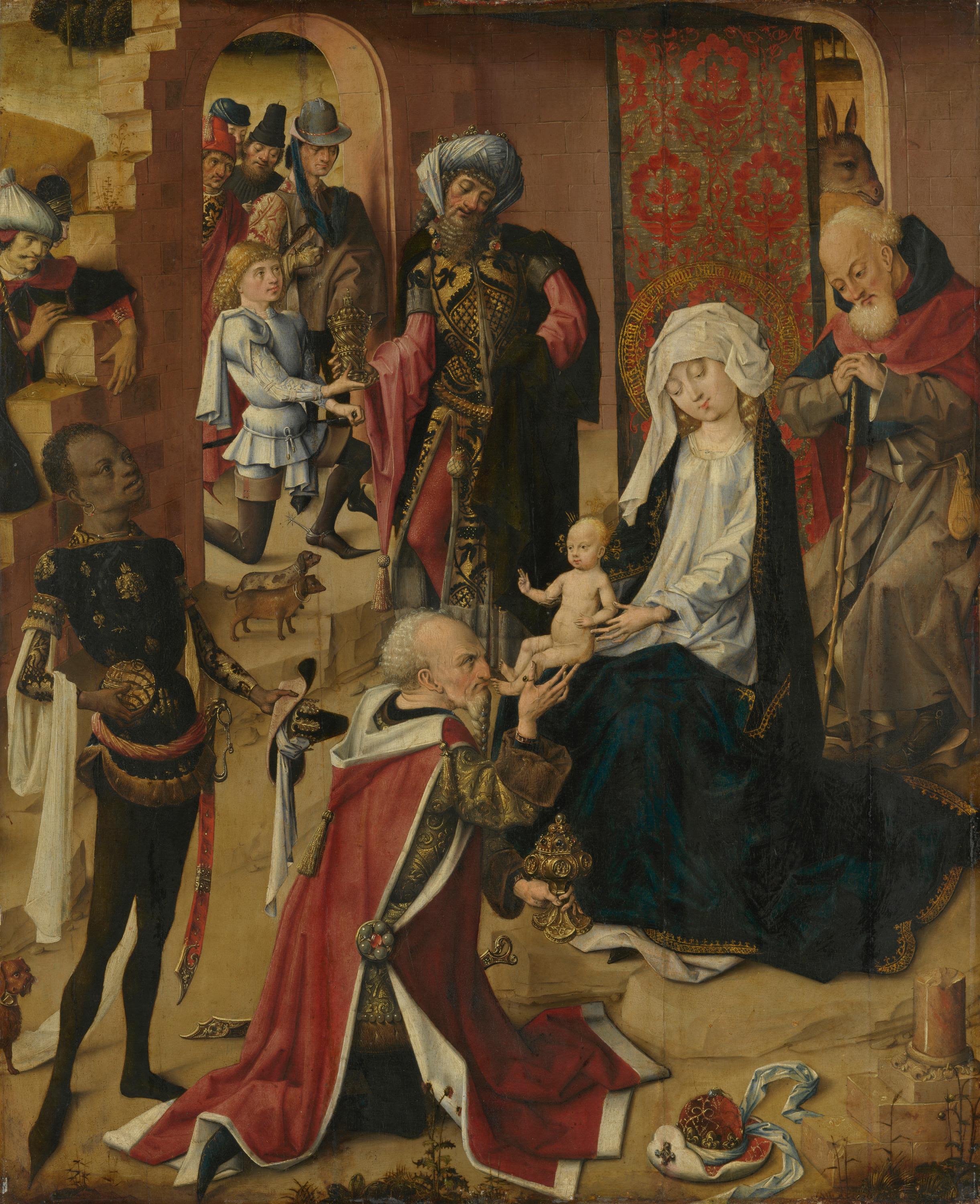 Mit großem Abstand zueinander nähern sich die Könige dem Jesuskind, um ihre Geschenke zu bringen. Der Vordere und Älteste kniet bereits vor ihm und deutet einen Fußkuss an, mit dem er das Kind begrüßen will. Die Tafel war Teil eines Flügelaltars. Oberhalb sah man das ›Zusammentreffen der drei Könige‹, auf deren Rückseite die ›Himmelfahrt Mariens‹ (J. Paul Getty Museum, Los Angeles). Zugehörig sind Tafeln in Paris und ehemals Berlin.