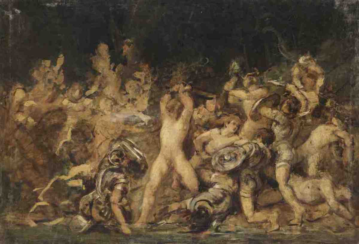 Hans Makart(Umkreis), Kampf zwischen Römern und Germanen, vor 1884, Bayerische Staatsgemäldesammlungen – Neue Pinakothek, URL: https://www.sammlung.pinakothek.de/de/artwork/28eGVow4WQ (Zuletzt aktualisiert am 11.12.2025)