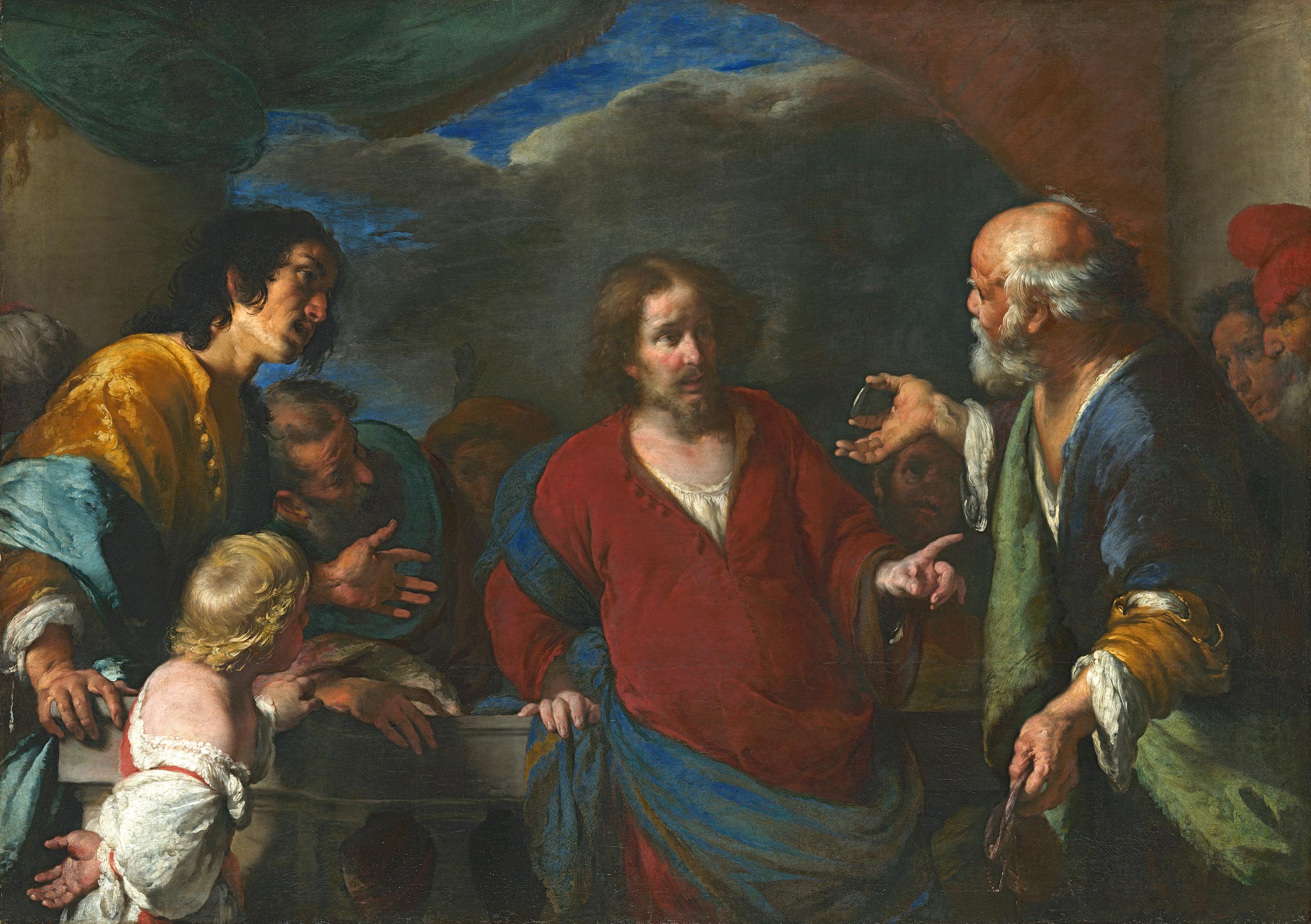 Im Neuen Testament wird berichtet, wie die Pharisäer Jesus auf die Probe stellen und ihn fragen, ob es erlaubt sei, dem Kaiser Steuern zu zahlen. Er lässt sich daraufhin eine Münze zeigen, verweist auf das aufgeprägte Porträt des Kaisers und antwortet: »So gebt dem Kaiser, was dem Kaiser gehört, und Gott, was Gott gehört!« Strozzi, der aus Genua stammte und später in Venedig tätig war, vereint in seinen Werken Anregungen von Caravaggio und Rubens mit dem Kolorit der Venezianer.