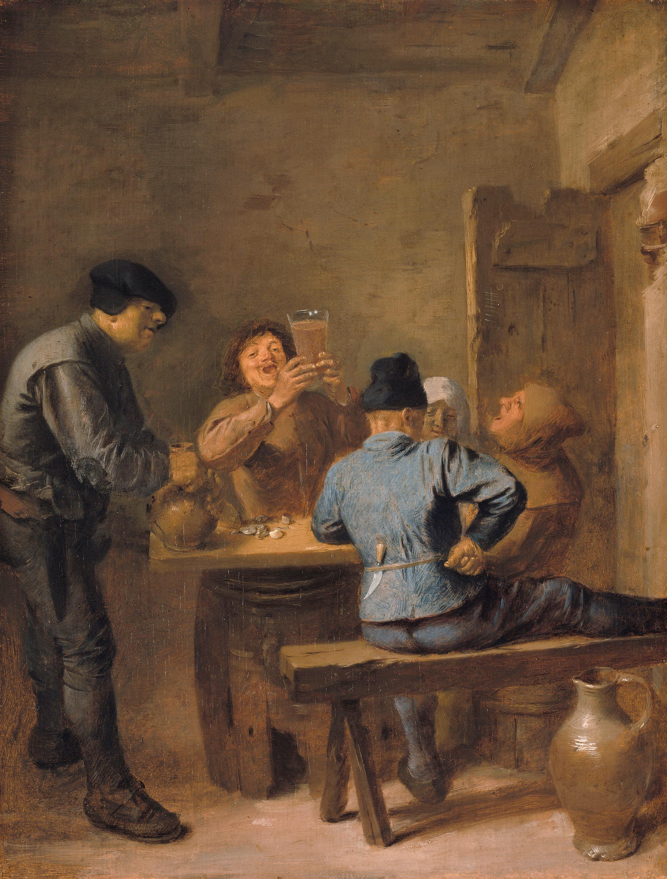 Einige Zecher, darunter eine Frau und ein Mönch, haben sich in einer schäbigen Spelunke versammelt. Glas und Krüge verweisen auf die Trunksucht, deren Folge nicht nur sexuelle Ausschweifungen, sondern auch Aggressionen sind, auf die das im Gürtel der Rückenfigur steckende Messer verweist.