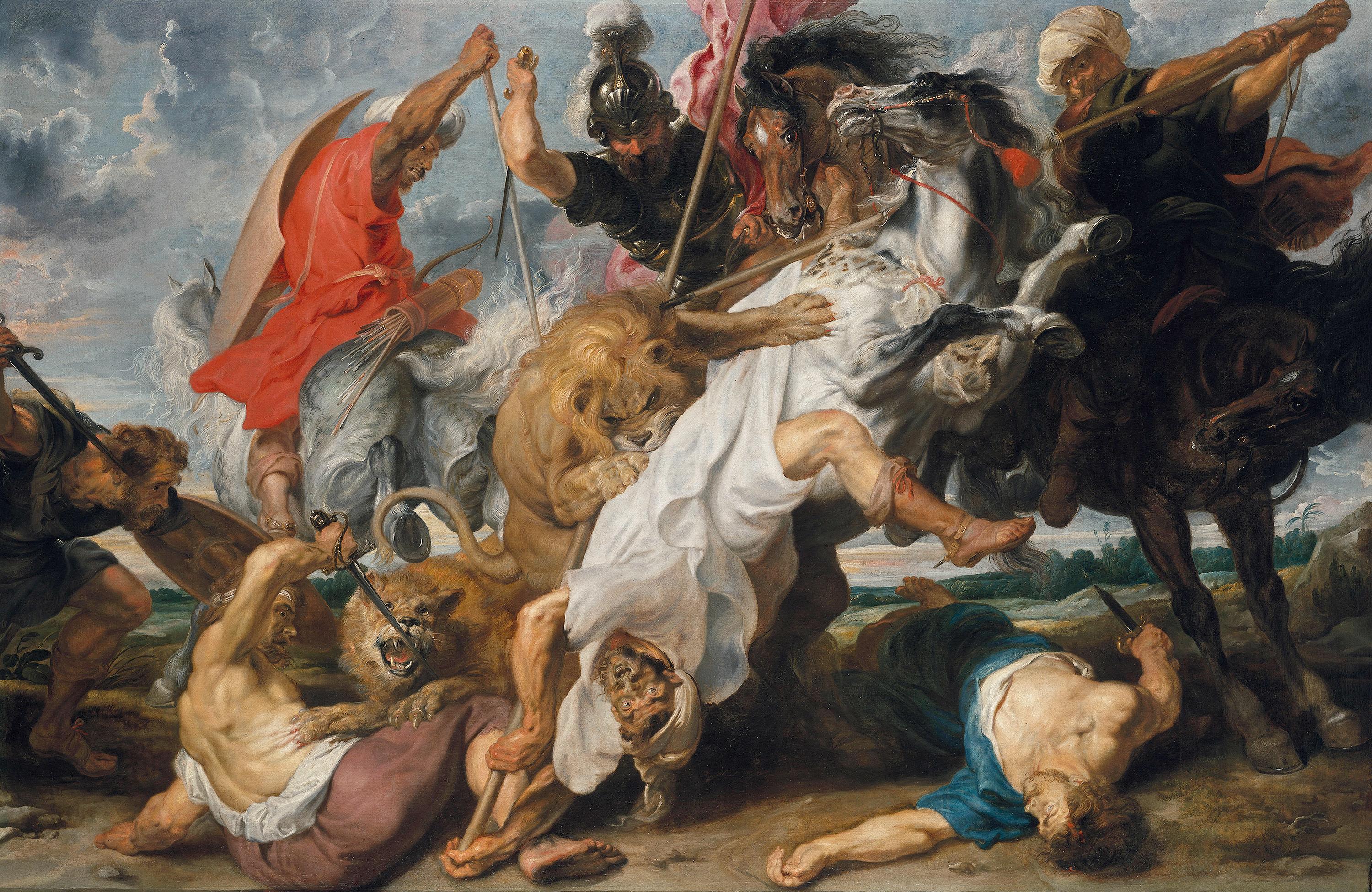 Rubens hielt einen affektgeladenen Moment in seinem spannungsreichen Höhepunkt fest: Pferde bäumen sich auf und schlagen mit ihren Hufen aus, Jäger setzen ihre Speere ein. Einer holt aus und wird mit seinem Schwert die Beute zur Strecke bringen. Den Mittelpunkt der Szene bildet das in der Münchner Ölskizze (Inv. Nr. 15475) bereits angelegte Motiv des Reiters, der von einem Löwen attackiert und vom Pferd gezerrt wird. Das Motiv der Krallen, die der Löwe in den Körper eines Pferdes gräbt, folgt einem antiken Vorbild, und die Pferde selbst sind von Leonardos ›Anghiari-Schlacht‹ beeinflusst.