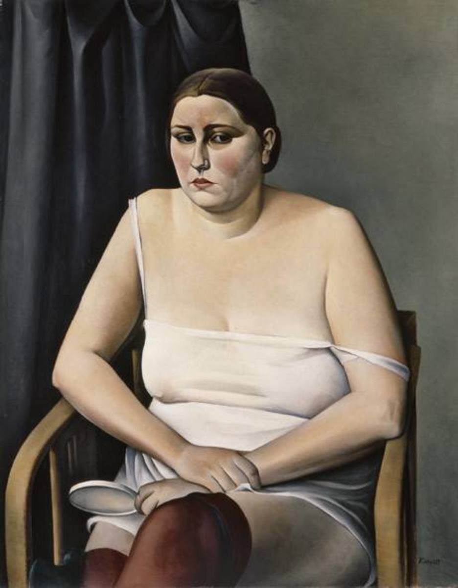 Zu den seltenen Figurenbildern im Werk des Stillleben- und Landschaftsmalers Alexander Kanoldt zählt diese Darstellung, die motivisch dem Verismus eines Otto Dix nahe zu stehen scheint. Schonungslos konfrontiert der Maler dem Betrachter die Dirne, der er durch die präzise, nüchterne Sicht jegliche erotische Ausstrahlung einer expressionistisch aufgefassten Kokotte nimmt. So zuständlich wie der Vorhang wird die Matrone zur reinen Bestandsaufnahme, zum Stück. Der unbeteiligte Blick registriert die roten Strümpfe und den weißen Unterrock ebenso gleichwertig wie das entblößte Fleisch und das Gesicht, in dem sich hartes Leben, Verschlossenheit und misstrauische Distanz spiegeln. Die Intaktheit, das „klassische“ Gleichgewicht, die Ruhe und Ordnung des Porträts sind trügerisch. Überscharf und oberflächengenau gesehen, präsentiert sich die Realität als verdinglichtes und entfremdetes Gegenüber. Die annähernd frontale Position, die Rahmung von Stuhl und Vorhangbahn sowie die radikale Überschneidung durch den unteren Bildrand erzeugen einen Ort absoluter Unfreiheit für die Frau. Obwohl Kanoldt die kritische Überzeichnung von Dix vermeidet und vor allem die Bildtektonik als ausgleichendes Moment wirken lässt, entlarvt er hier,