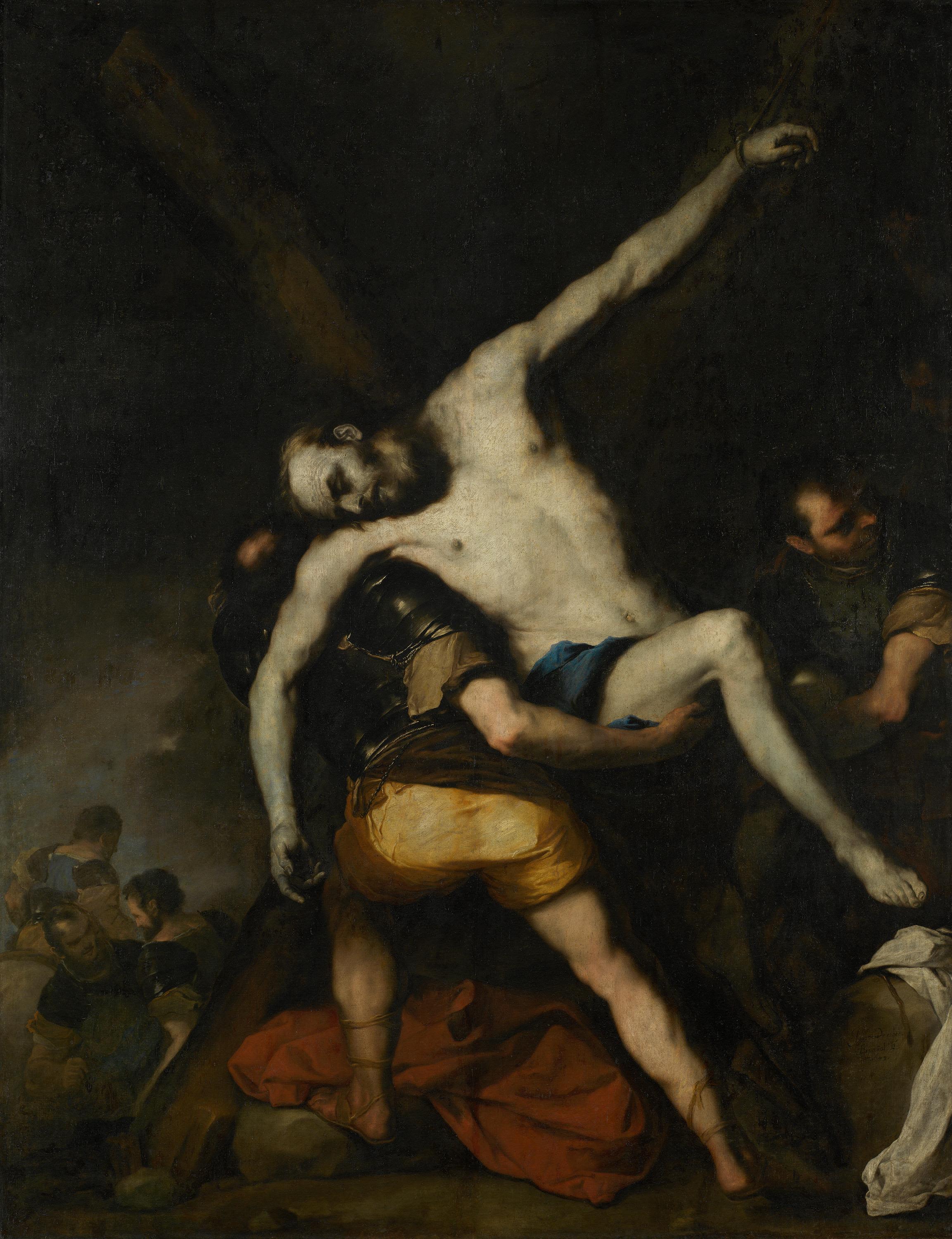 In seiner frühen Schaffenszeit war für Luca Giordano die Malerei des Jusepe de Ribera vorbildlich. Virtuos imitierte er den durch scharfe Helldunkelkontraste gekennzeichneten Stil des spanischen Meisters, der ebenfalls vor allem in Neapel tätig war. Für den Kunstmarkt wurden einige seiner Werke vermutlich sogar von ihm selbst mit einer Ribera-Signatur versehen – so auch diese ergreifende Darstellung des heiligen Andreas. Ein in Rückenansicht gezeigter Soldat hebt den fahl leuchtenden Leichnam des Apostels vom Kreuz.