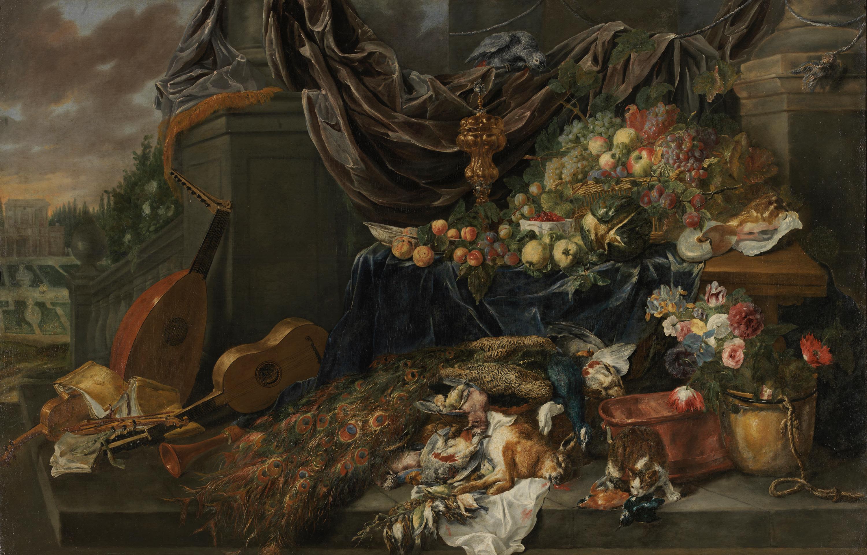 Dem Typus des Prunkstilllebens fügte der auf Jagdstücke spezialisierte Fyt oft erlegte Beute oder Tiermotive hinzu. Das Herrenhaus im Hintergrund spielt auf die Funktion solcher Stillleben an, die häufig in den Speisezimmern vermögender Auftraggeber hingen. Möglicherweise verbirgt sich hier zudem eine Anspielung auf die fünf Sinne, denn die Instrumente könnten für das Gehör, die Blumen für den Geruch, die Früchte für den Geschmack, der spiegelnde Pokal für den Seh- und die Katze für den Tastsinn stehen.