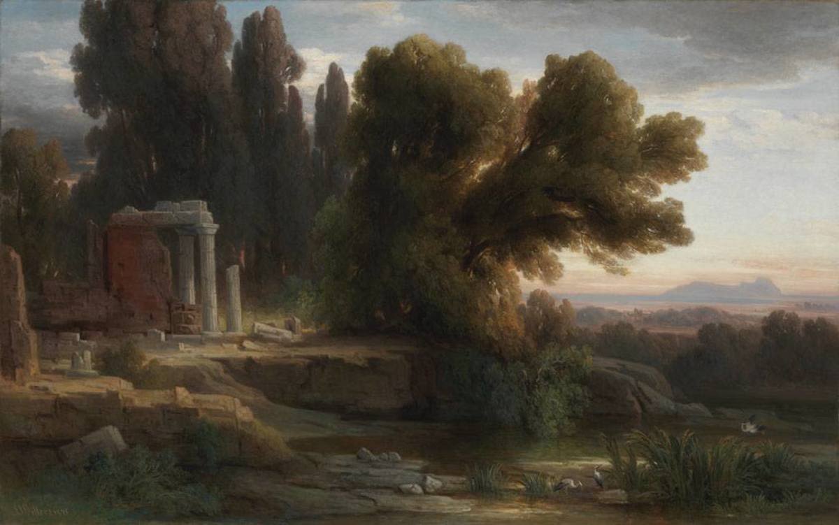 Das Gemälde zeigt die Aussicht vom Parco Chigi bei Ariccia nach Südosten über die Pontinische Ebene auf die Küste des Tyrrhenischen Meeres. In der dunstigen Ferne erhebt sich der Monte Circeo aus dem Meer, der sagenumwobene Sitz der Zauberin Circe. Die Landschaft weckt damit die Erinnerung an die Odyssee und die Welt Homers. Die Ruine des toskanischen Tempels links ist eine freie Erfindung des Künstlers.