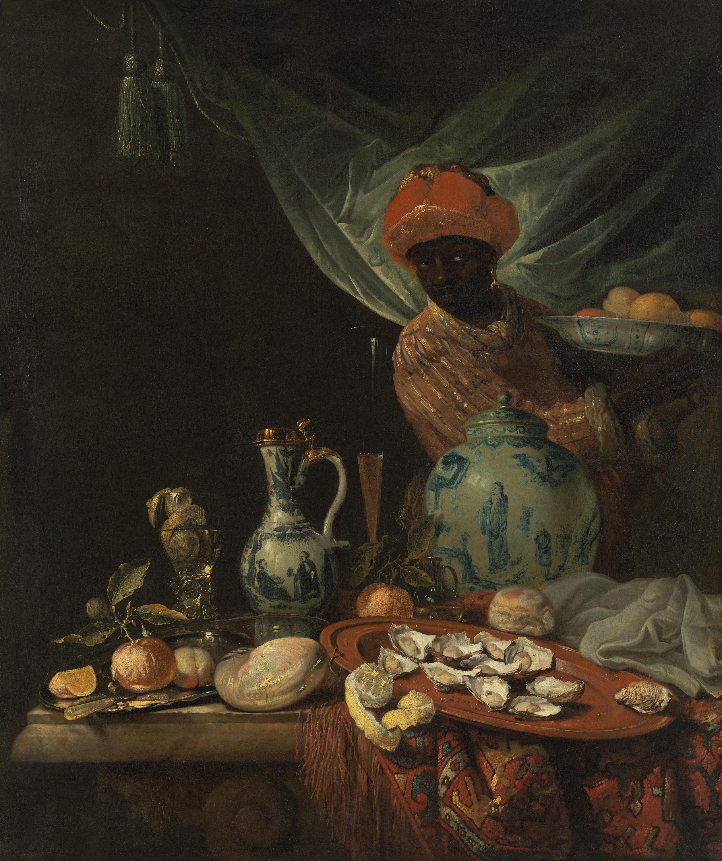 Das Stillleben wird zusammen mit einem jungen Mann afrikanischer Ursprungs präsentiert, der kostbar gekleidet ist und dadurch in diesem Kontext ebenfalls zu einem Luxusgut gemacht wird, das die damals führenden und vermögenden Schichten aus fernen Weltgegenden importierten. Nicht zufällig erscheint er in der Rolle als „Diener“, denn Menschen aus anderen Ländern wurden oft versklavt und mussten als Bedienstete arbeiten. Aus heutiger Perspektive ist diese Sichtweise herabwürdigend und klar eine Missachtung persönlicher Freiheit.