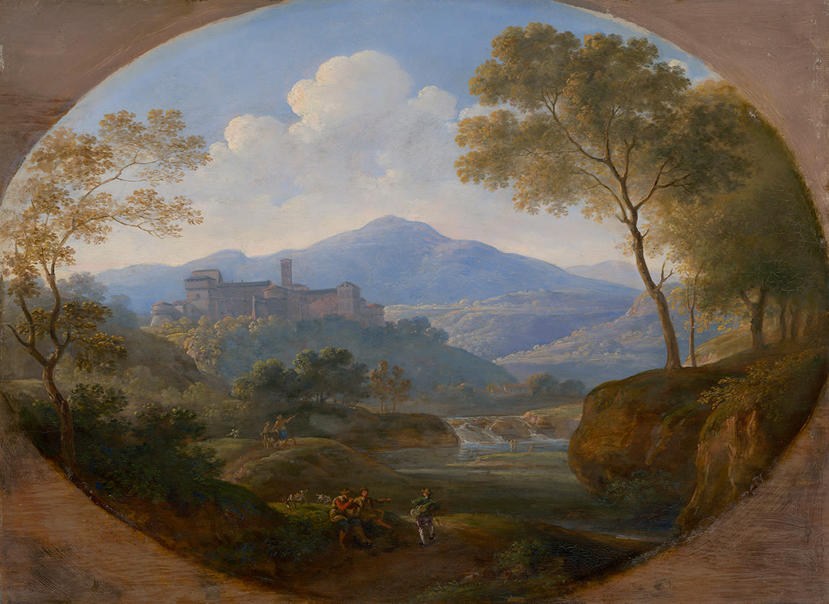 Das Bild ist in die Atmosphäre eines dunstigen Lichts getaucht, die ebenso wie das ungewöhnliche Format des Ovals auf den Einfluss Claude Lorrains zurückzuführen sind. Diese Art der Darstellung ist nicht typisch für Dillis, doch darf das Gemälde als ein charakteristisches Zeugnis für den zeitgenössischen Umgang mit der malerischen Landschaft der Albaner Berge gelten. Dillis hatte Grottaferrata während seines ersten Italienaufenthalts in den Jahren 1794/95 wiederholt dargestellt. So können ein umfangreiches Konvolut an Zeichnungen wie auch zwei Aquarelle als motivische Vorläufer des Ölgemäldes identifiziert werden. Sie machen deutlich, dass Dillis in der ausgeführten Fassung die topographischen Gegebenheiten kompositorischen Veränderungen unterworfen und den Fluss sowie den Vordergrund idealisierend hinzukomponiert hat.