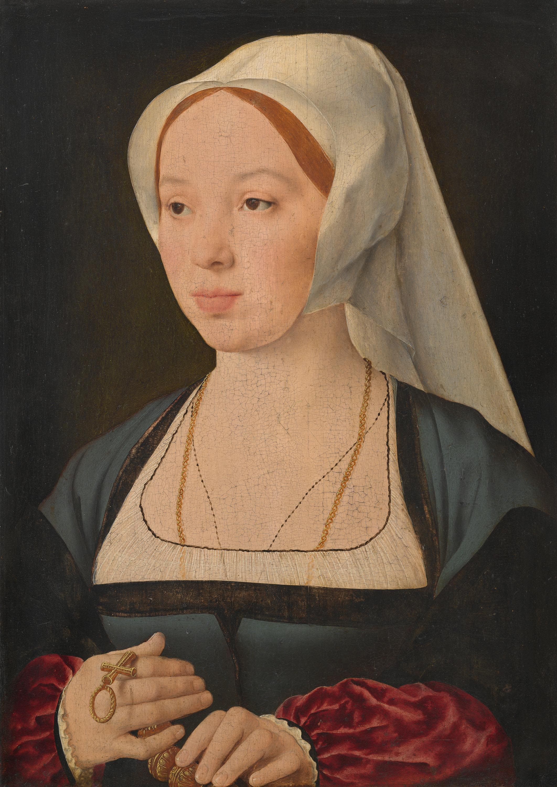 Das Bildnis war als Gegenstück zu einem Männerbildnis konzipiert, stilistisch steht es den Stiftern des ›Marientod‹-Triptychons in Saal I nahe. Die junge Frau gehört Kleidung und Habitus zufolge dem wohlhabenden Bürgertum an.