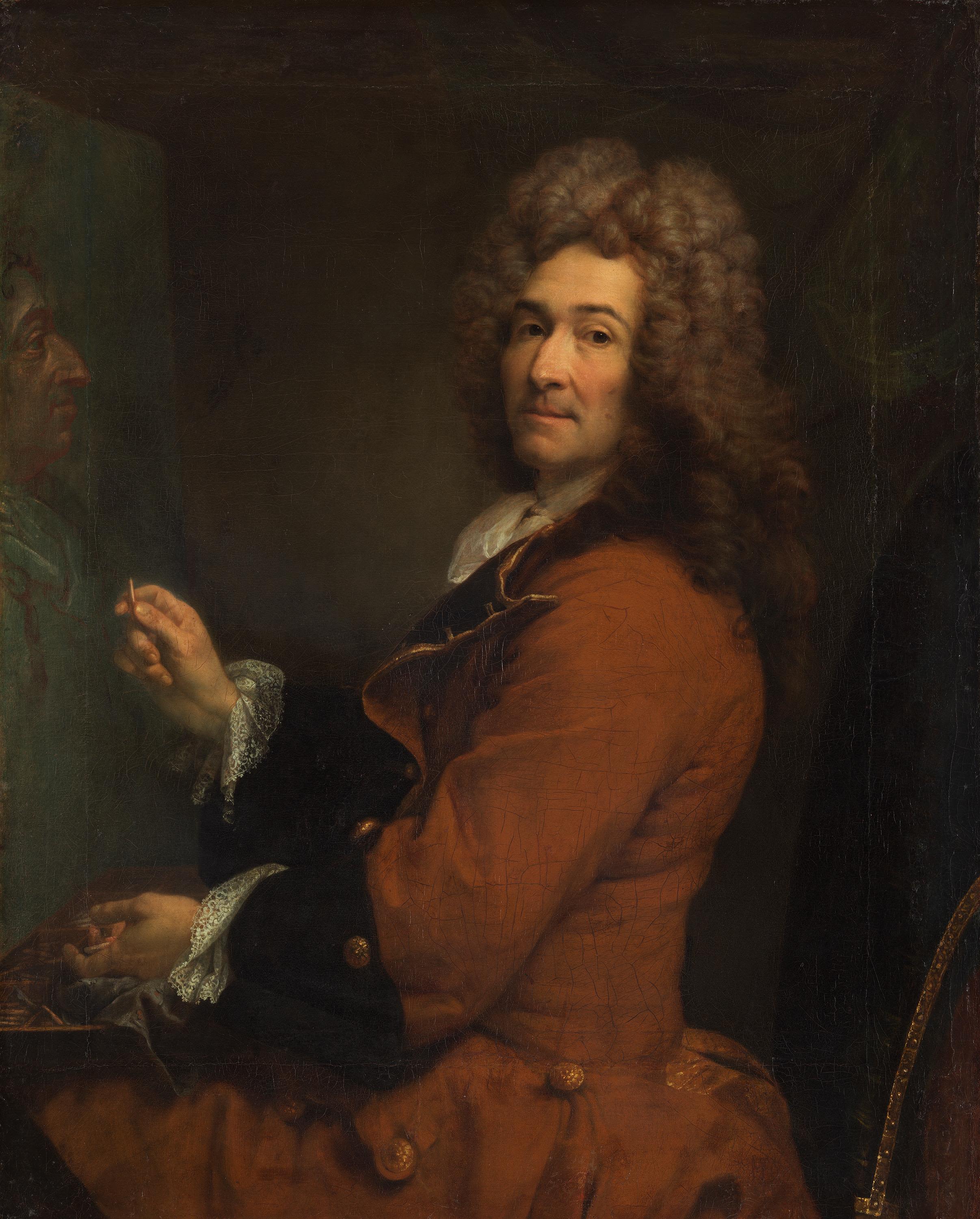 Selbstbewusst, doch zugewandt blickt der Künstler aus dem Bild; er ist gerade damit beschäftigt, ein Porträt Kurfürst Max Emanuels in Pastell zu malen. Auf dem Schoß liegt der Kasten mit den Pastellkreiden. Mit seinem eleganten Rock, den Spitzen