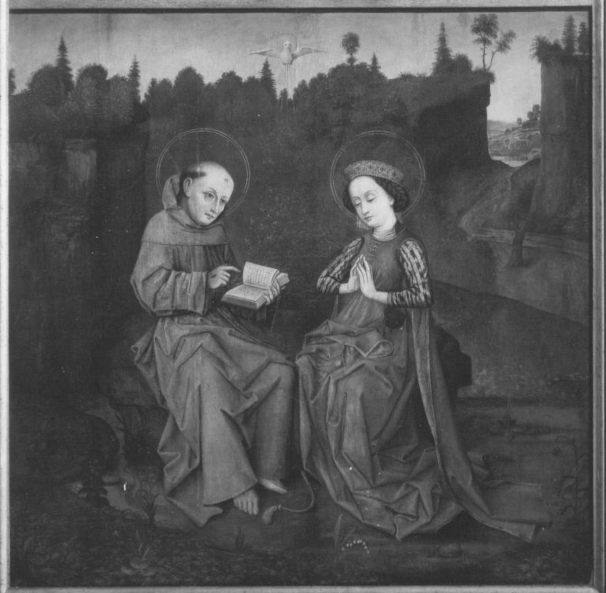 Meister des Bamberger Klarenaltares, Klarenaltar: Die hl. Klara empfängt die Lehren des hl. Frankiskus, 3. V. 15. Jh., Bayerische Staatsgemäldesammlungen – Staatsgalerie in der Neuen Residenz Bamberg, URL: