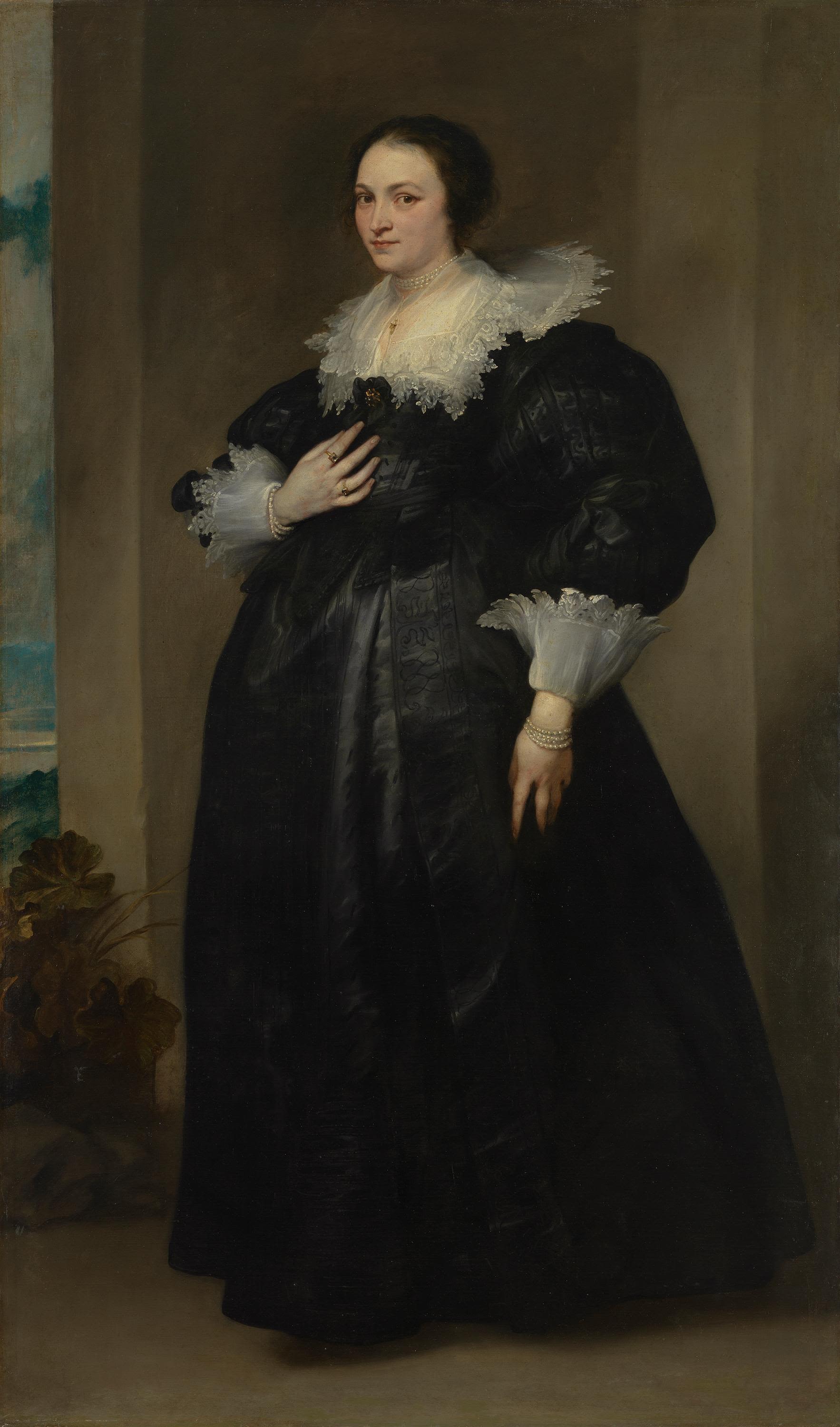 Lange galten die Pendants eines unbekannten Paares als eigenhändige Werke van Dycks (vgl. Inv. Nr. 369). Doch jüngste Untersuchungen führten zum Ergebnis, dass es sich offensichtlich um Erzeugnisse der Werkstatt handelt. Dafür spricht nicht nur die im Vergleich zu eigenhändigen Porträts geringere Qualität, sondern auch der Röntgenbefund. Dieser machte unter den Gesichtern ovale weiße Formen sichtbar: Offensichtlich wurden diese zunächst ausgespart. Anscheinend hielt man solche weitgehend fertiggestellte Bildnisse in der van Dyck-Werkstatt für sich spontan einstellende Kundschaft bereit, so dass nur noch die Konterfeis eingefügt werden mussten.