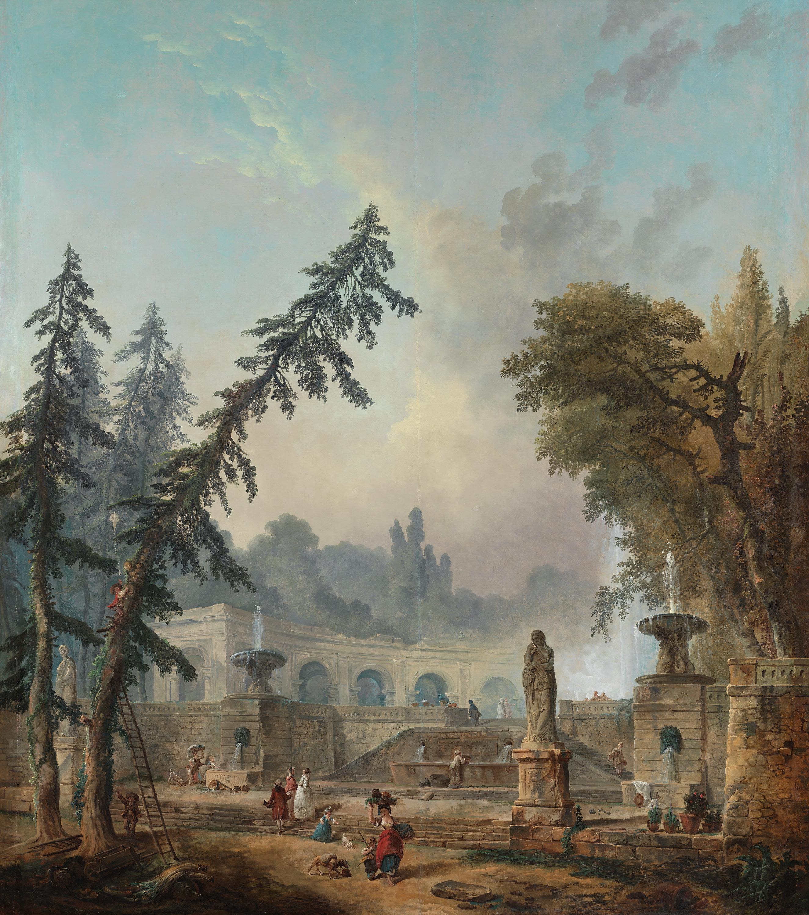 Dieses Gemälde – das Gegenstück zur ›Landschaft mit römischer Tempelruine‹ (Inv.-Nr. 14717) – zeigt eine Brunnenanlage mit Fontänen und antiken Trögen, in die das Wasser fließt. Bepflanzte Blumentöpfe signalisieren, dass sich das Bauwerk in einem Park befindet; Bauern und elegante Spaziergänger kommen vorbei, rasten oder lustwandeln hier. Die Skulptur rechts im Vordergrund zeigt eine Vestalin und ist als Verkörperung der Tugendhaftigkeit zu lesen.
