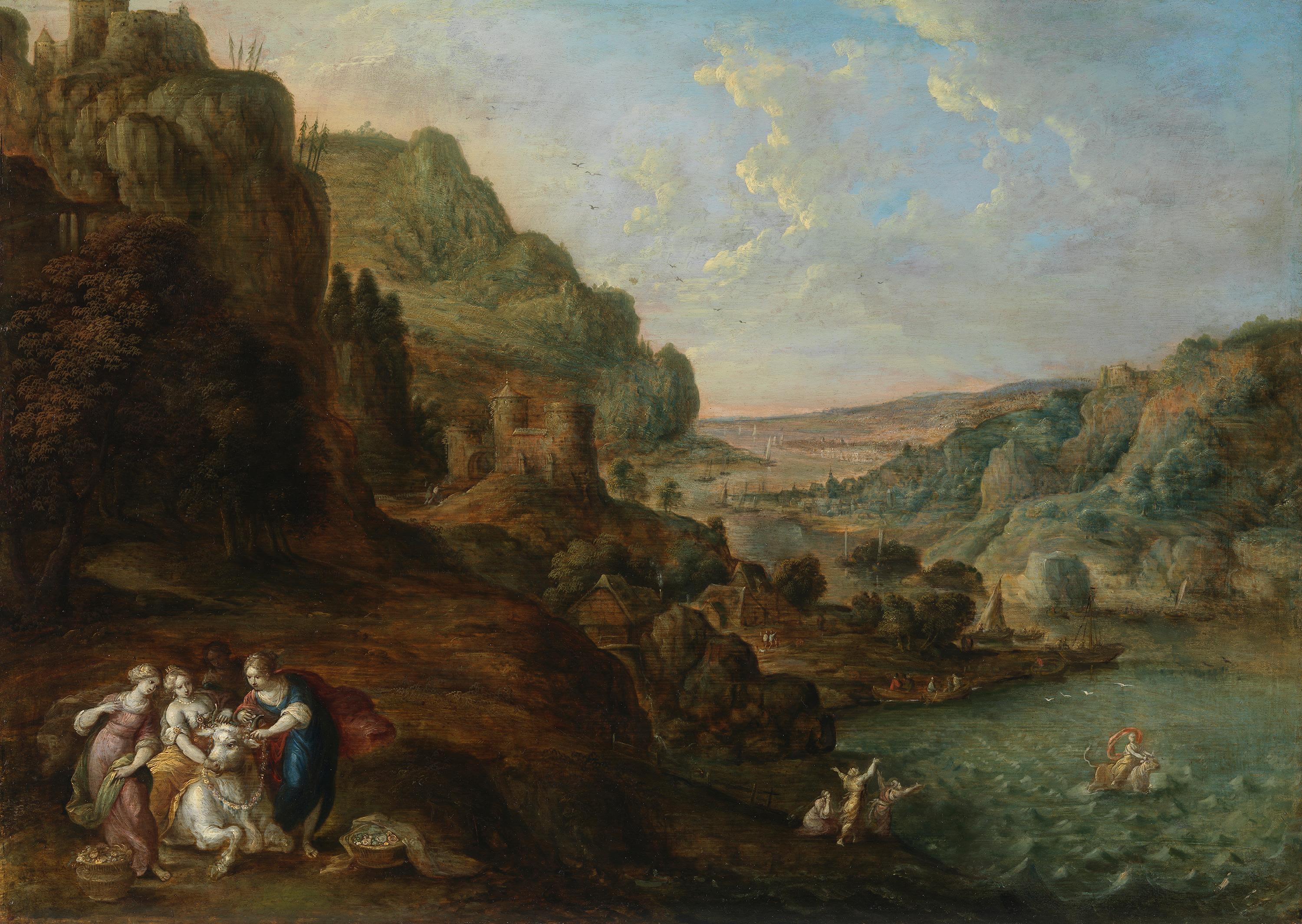 Jan Tilens, Küstenlandschaft mit Entführung der Europa (mit Staffagefiguren von Frans Francken II), Staatsgalerie im Schloss Johannisburg, URL: https://www.sammlung.pinakothek.de/de/artwork/QKGBMl9LBb (Zuletzt aktualisiert am 18.10.2025)