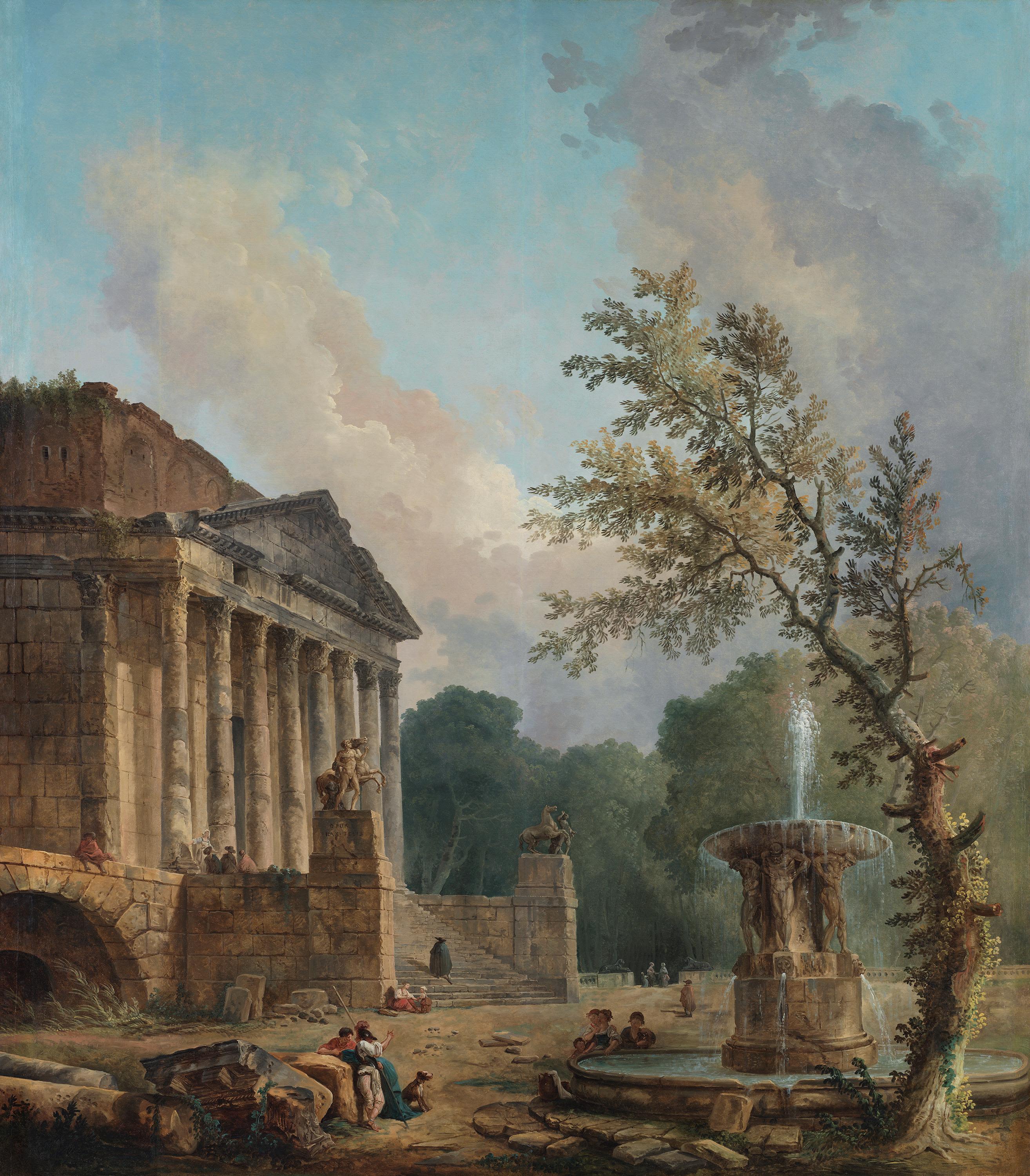Gemeinsam mit der ebenfalls in der Alten Pinakothek präsentierten ›Parklandschaft‹ (Inv.-Nr. 14716) und vier weiteren Bildern war das Gemälde Teil eines Zyklus, der wahrscheinlich als Raumdekoration diente. Beide Bilder geben keine realen Landschaftseindrücke wieder. So verweist die Tempelruine in diesem Gemälde zwar deutlich auf das Pantheon in Rom, das Gebäude wurde jedoch in charakteristischer Weise abgewandelt und etwa um die berühmten Skulpturen der Rossebändiger vom Quirinal ergänzt.