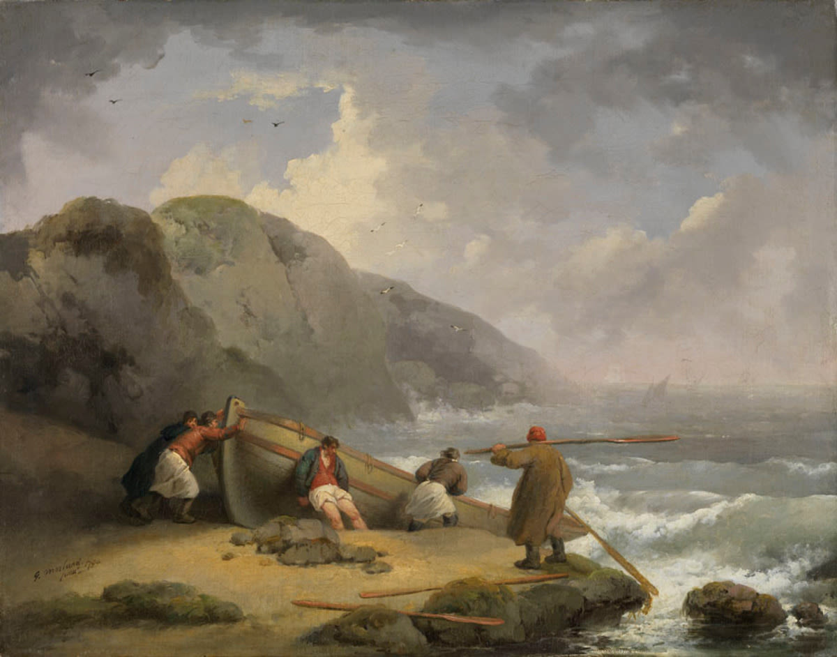Morland zeigt sich in seinen Landschaften und populären ländlichen Genreszenen von niederländischen Gemälden des 17. Jahrhunderts beeinflusst. Diese Küstenlandschaft mit einigen Fischern gelangte bereits um 1800 nach Deutschland. Die beobachtende Haltung und die dünne, flüssige Malerei sind charakteristisch für die Werke des Künstlers.