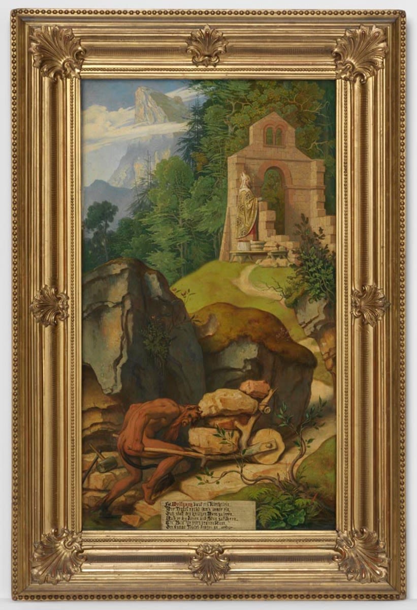 Die mittelalterliche Legende des hl. Wolfgang berichtet, dass der Teufel dem Heiligen beim Bau der Kapelle neben seiner Klause im Gebirge half. Als Gegenleistung verlangte er die Seele des ersten lebenden Wesens, das den Bau nach seiner Vollendung betreten würde. Der Bischof überlistete seinen Kontrahenten schließlich, indem er einen Wolf in die Kapelle schickte. Schwind interpretiert die Legende auf eigene Weise: Die Missgunst des Schicksals kann durch Witz und Tatkraft zum Guten gewendet werden.