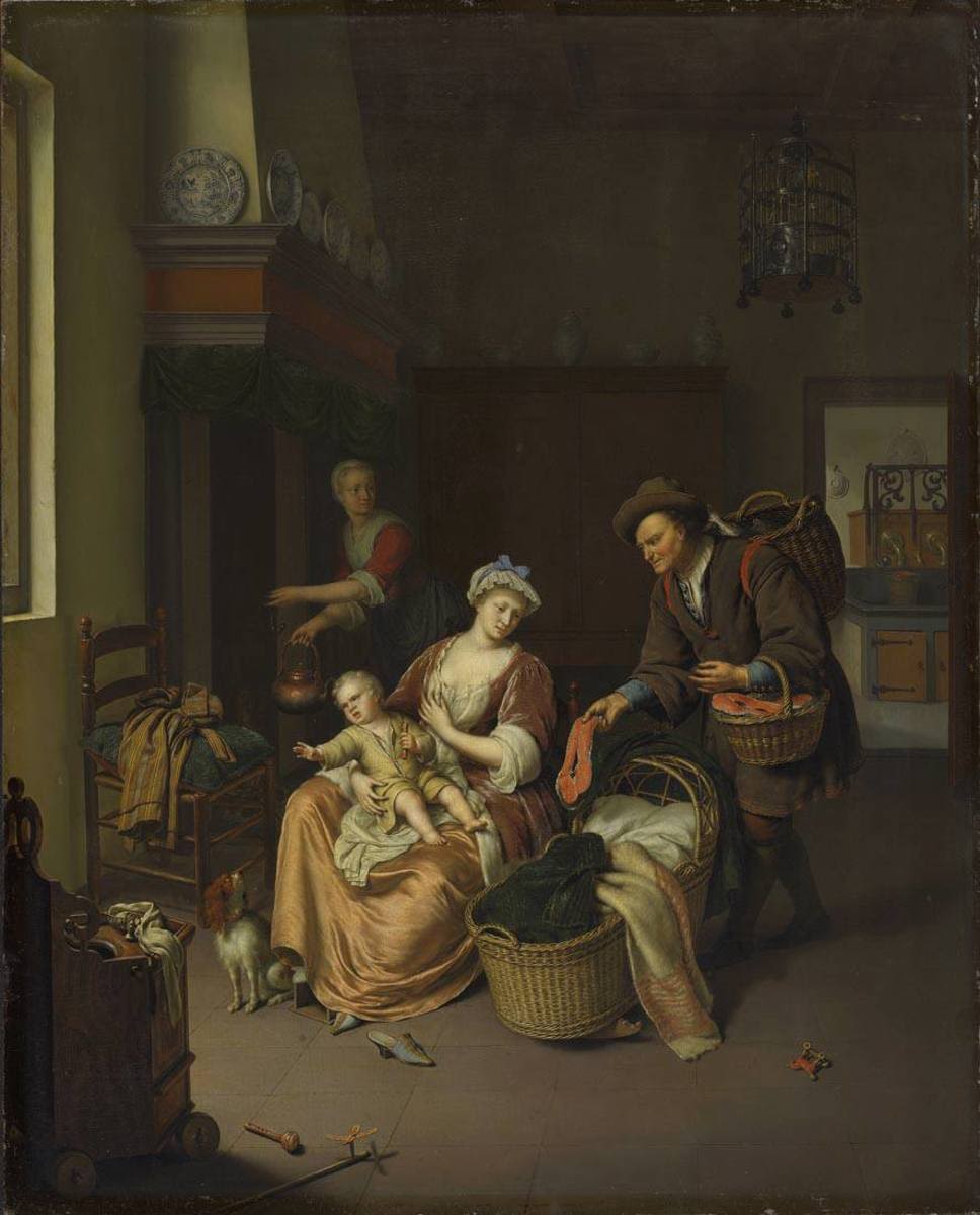 Willem van Mieris setzte im 18. Jahrhundert die Feinmalerei seines Vaters Frans erfolgreich fort und blieb der ikonografischen Tradition verpflichtet, die das Angeln wie das Feilbieten von Fischen als Sinnbilder der voluptas carnis, der fleischlichen Begierde, kennt.