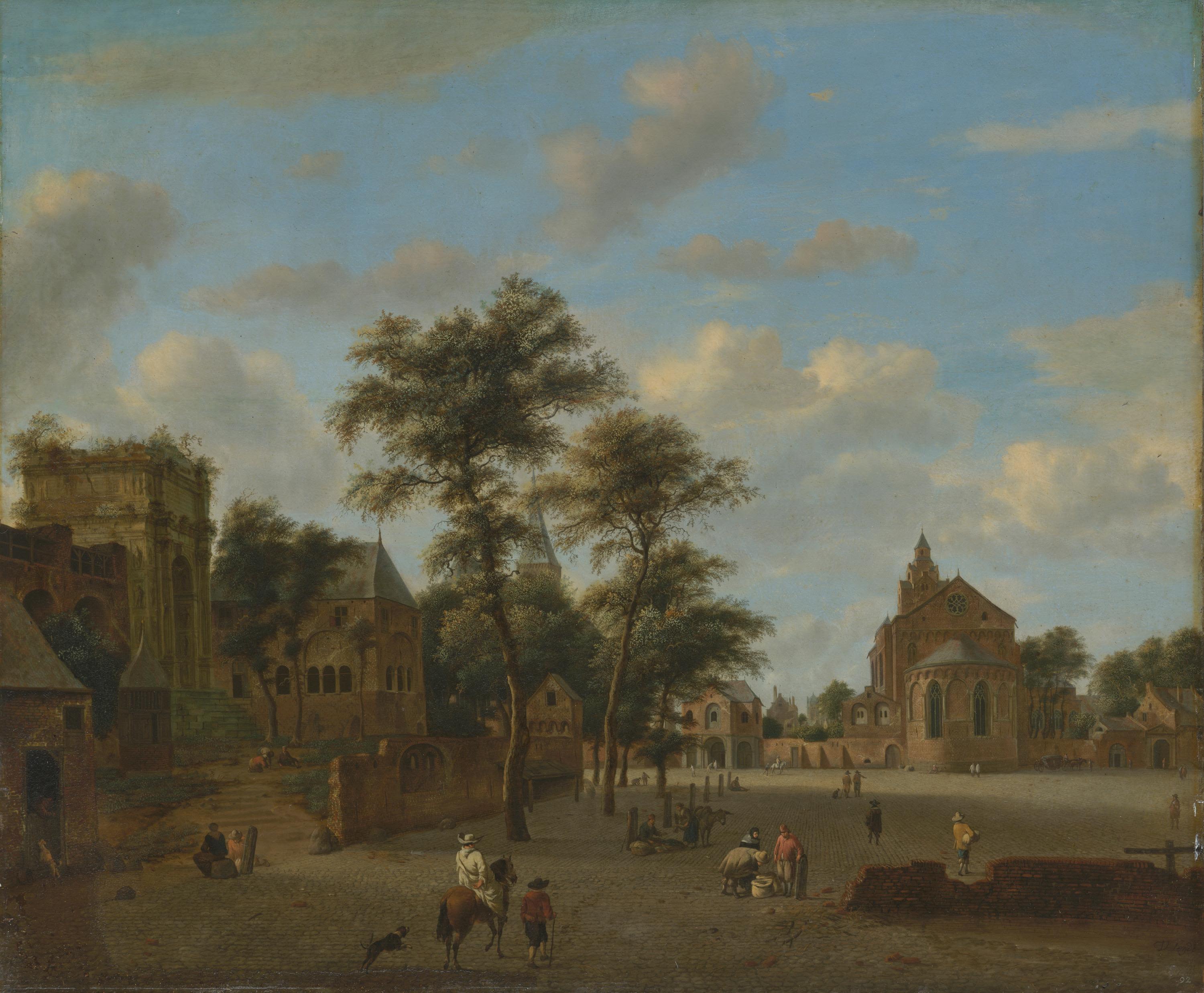 Die auf einer Reise am Niederrhein entstandenen Skizzen romanischer Sakralbauten in Köln (St. Maria im Kapitol, St. Gereon, St. Peter, St. Cäcilien) sind zu einem idealen Stadtbild frei zusammengeführt, das mit Figuren durch den Maler Johannes Lingelbach (1622–1674) belebt wird.