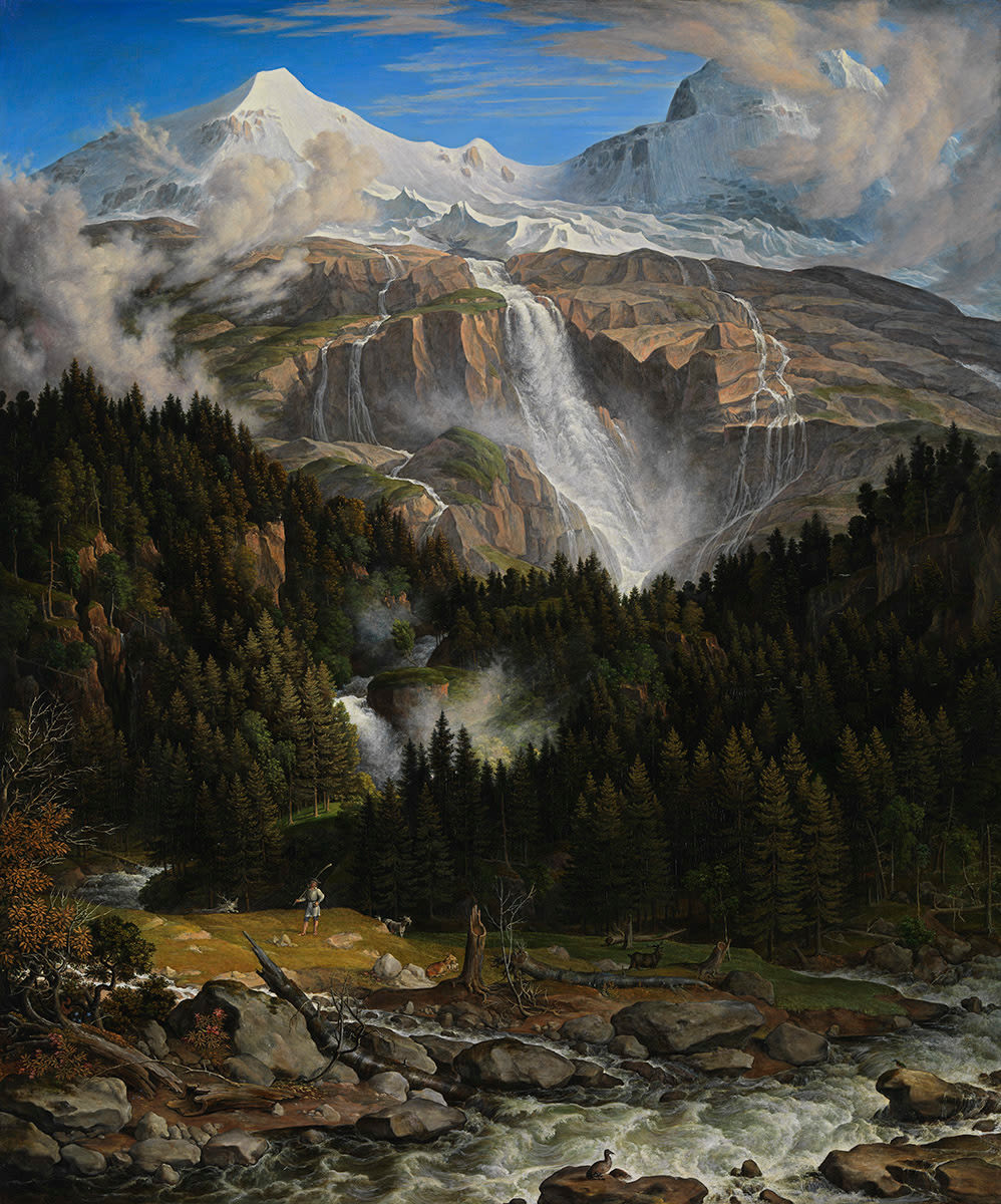 Koch holt durch seine detaillierte, extrem scharfzeichnende Malerei das Bergmassiv ganz nah an den Betrachter heran. Alle drei Bildzonen liegen gleichermaßen dicht an der Bildoberfläche: der Fluss und die Wiese im Tal, der Wald sowie der in einiger Entfernung gelegene schneebedeckte Gipfel. So bekommt die Hochgebirgslandschaft eine starke, fast physisch fühlbare Präsenz, die beim Betrachter den Eindruck des Überwältigtseins hervorruft.