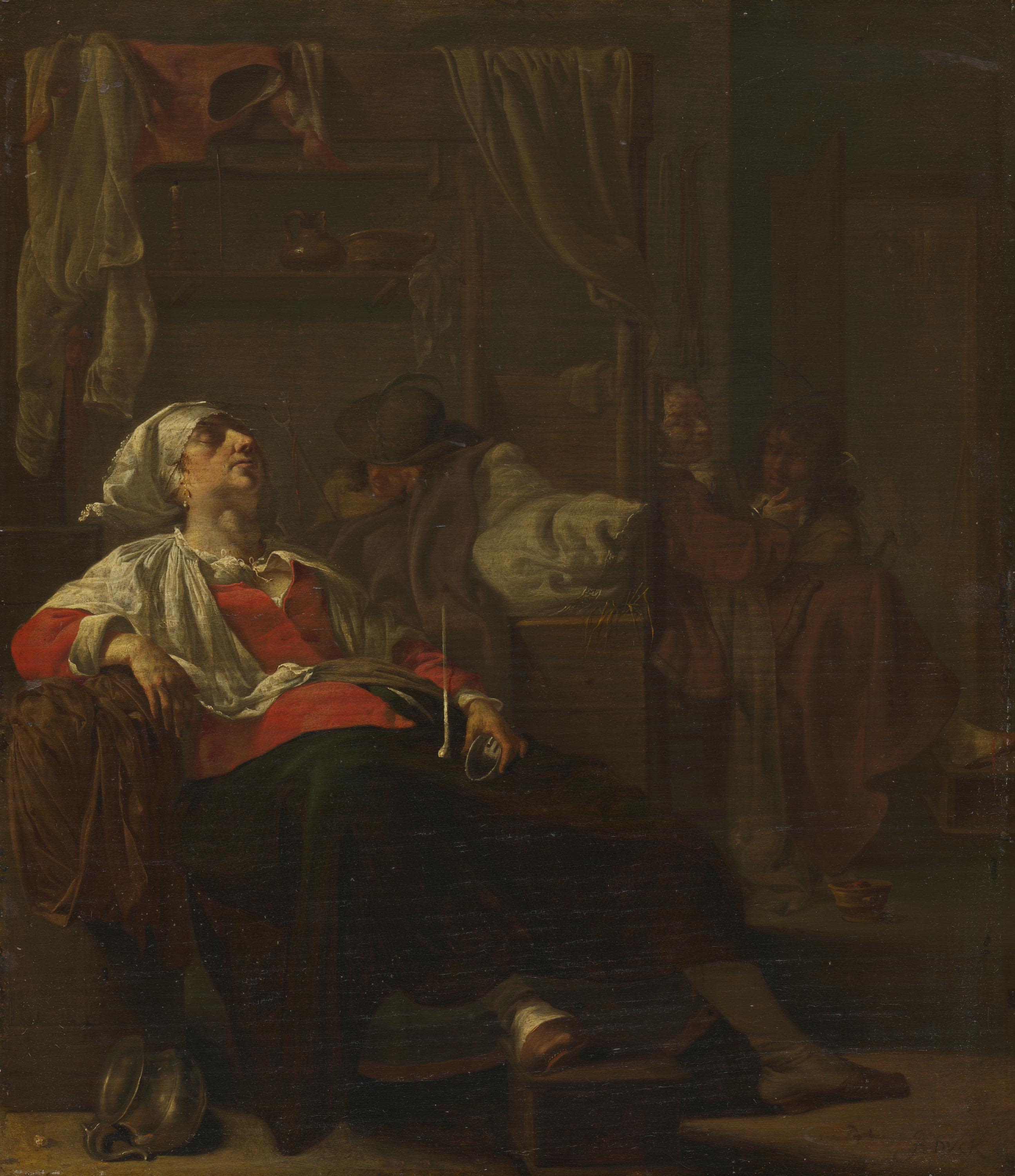 Der Utrechter Kleinmeister Duck schildert eine Bordellszene mit einer unordentlich gekleideten, dösenden Dirne, in deren Schoß eine Tabakspfeife phallusartig platziert ist. Der im Bett ruhende Freier und das vereinte Paar ergänzen das Bild vom lasterhaften und ungezügelten Treiben.