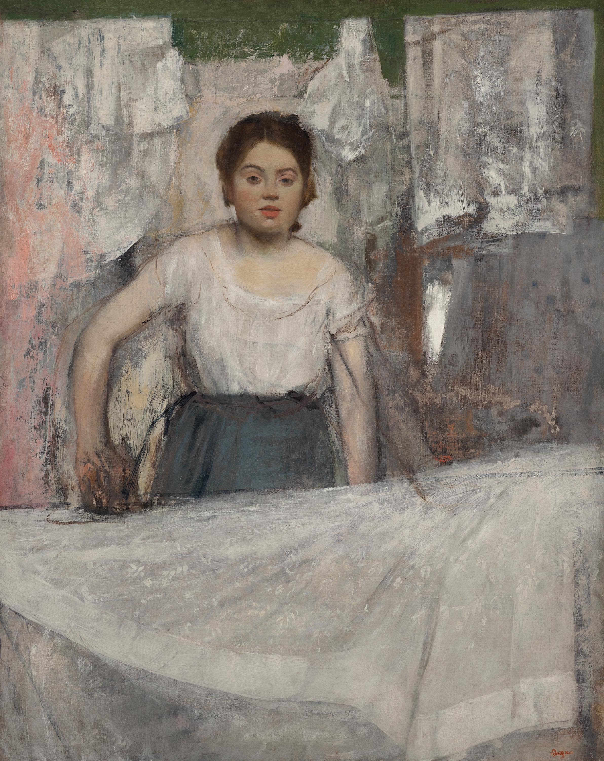 Edgar Degas hat das Thema der Büglerin hier zum ersten Mal behandelt. Ende der 1860er Jahre hatte er seine "Ingres-Periode" hinter sich und wandte sich zunehmend realistisch aufgefassten Gegenwartsstoffen zu. Bis 1902 malte er eine ganze Reihe von Büglerinnenbildern. Während in den späteren Fassungen der Arbeitsvorgang als solcher, also das Moment der Aktion vorherrscht, gilt in dieser frühen Fassung Degas' Interesse mehr der Person; sie hält in ihrer Arbeit inne und blickt auf den Betrachter: das Arbeitsbild hat eher den Charakter eines Porträts.