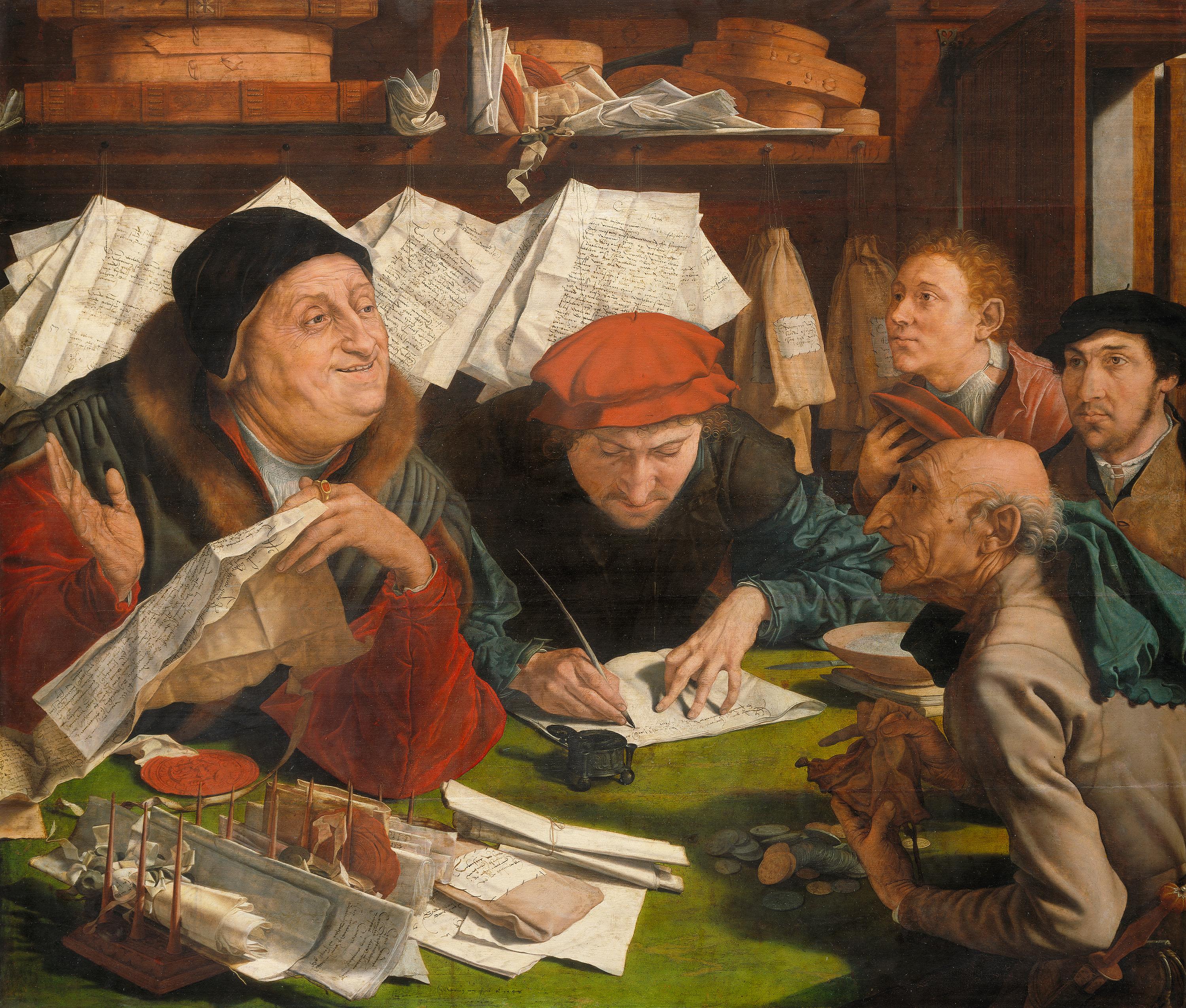 Schon auf den ersten Blick wird ersichtlich, worum es hier geht: Die linke Bildhälfte nimmt der selbstgewiss lächelnde Advokat ein, dessen korpulente Gestalt und kostbare Kleidung seine Dominanz unterstreichen. Sein Antipode ist ein ausgezehrter Mann rechts, der aus einem Beutel die letzten Münzen auf den Tisch fallen lässt. Van Reymerswaele nimmt hier das Rechtswesen aufs Korn: Die Schriftstücke zeugen von nie endenden (und aussichtslosen) Prozessen, von denen nur die Advokaten profitieren, während sie die Klienten – ihrerseits unverträgliche Streithähne – das letzte Hemd kosten.