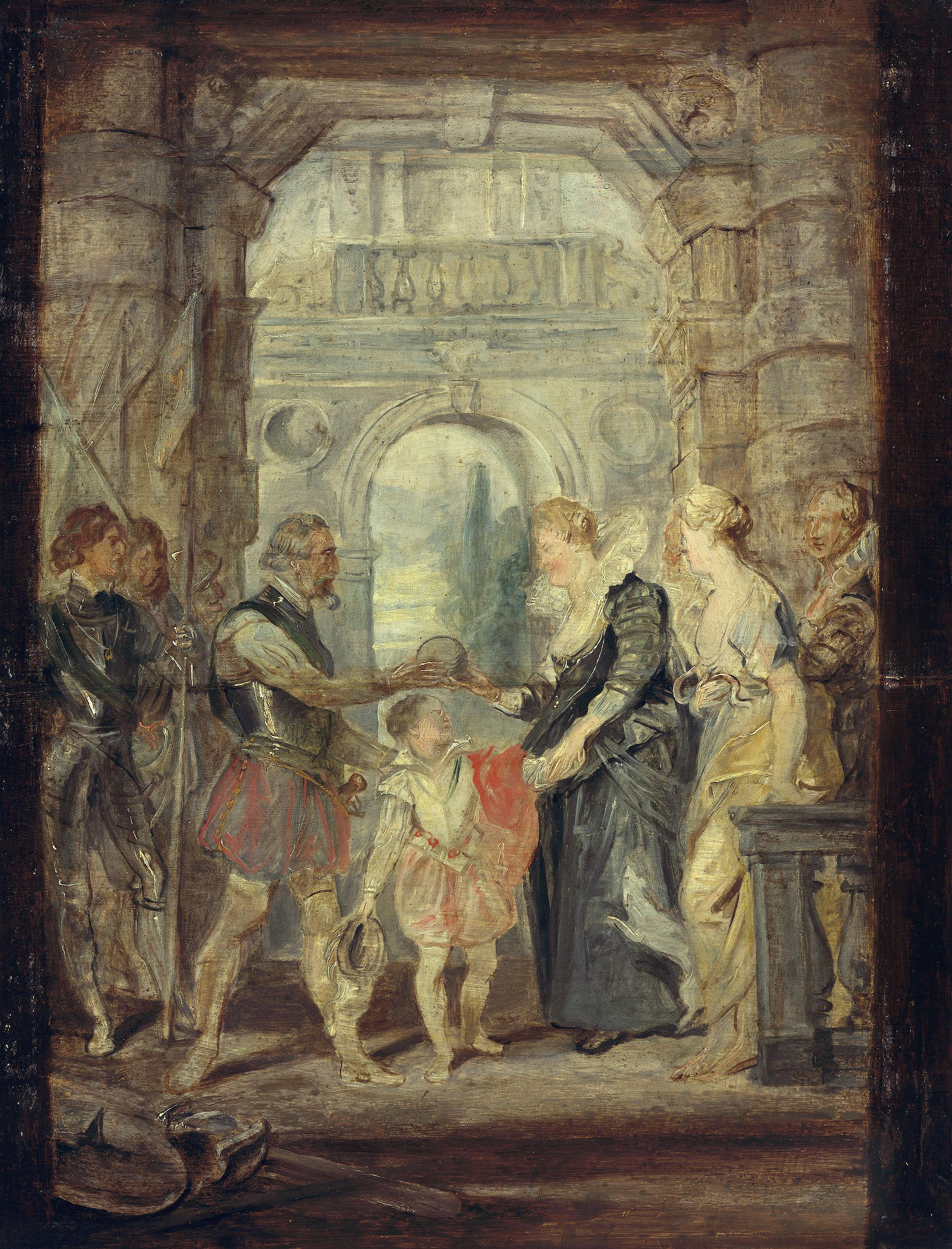 Um die Herrschaft für seinen noch minderjährigen Sohn zu sichern, übertrug der König, bevor er in den jülich-klevischen Erbfolgekrieg zog, die Regentschaft an seine Frau. Der zustimmende Blick ihres Kindes unterstreicht die Legitimation und die Kontinuität der Herrschaft.