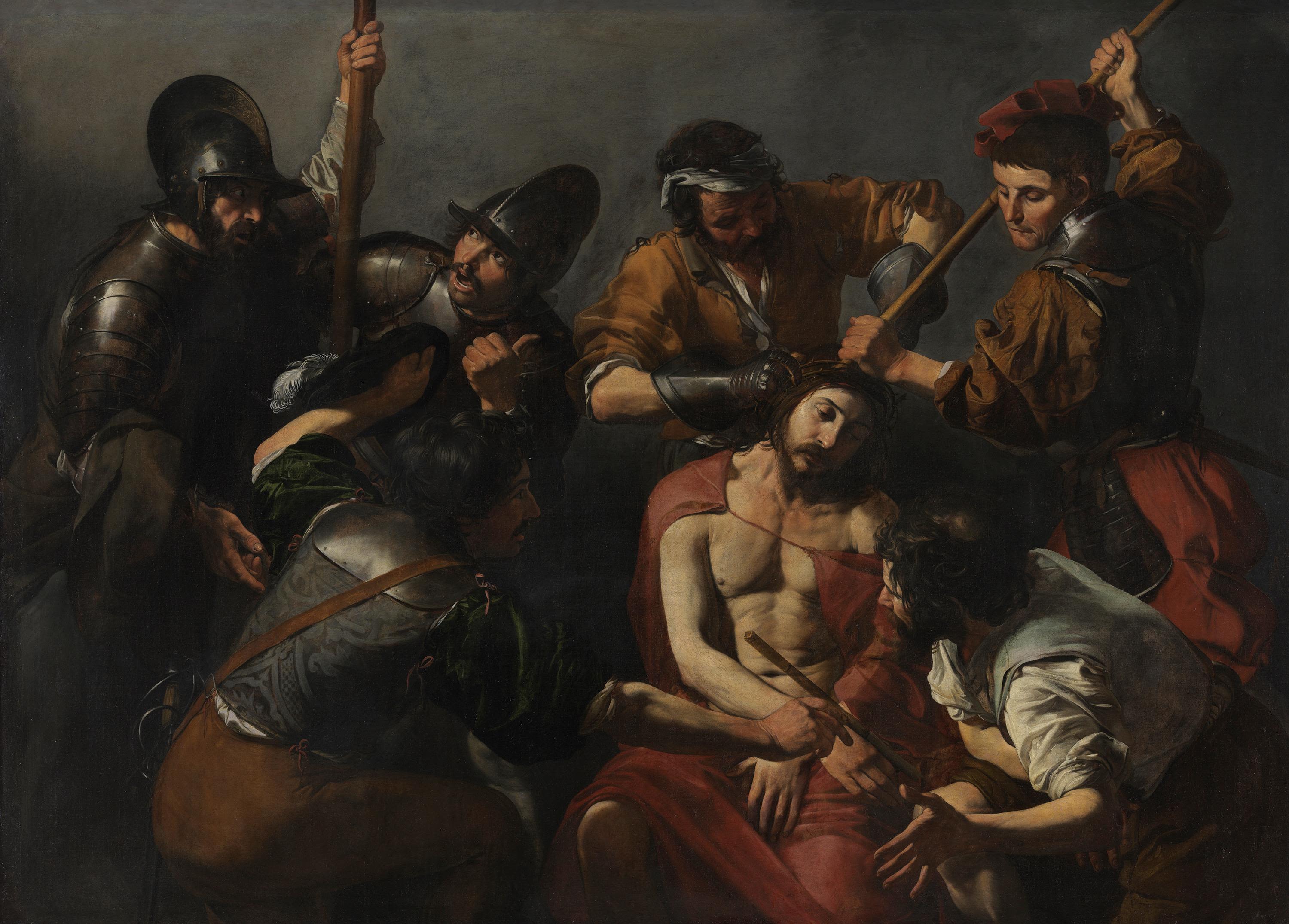 Vor dem Gang nach Golgatha wird Jesus verspottet und gequält; ihm wird eine Dornenkrone auf das Haupt gedrückt. Zwischen den gewaltsam-geschäftigen Schergen erduldet er still sein Leid. Der dunkle Hintergrund, das gezielt eingesetzte Licht, die naturalistische Schilderung des Oberkörpers Christi, die Fantasiekostüme der folternden Soldaten – all dies erinnert an die Werke Caravaggios und seines Nachfolgers Bartolomeo Manfredi. Es verwundert nicht, dass dieses wichtige Gemälde Valentins einst als Werk Manfredis galt.
