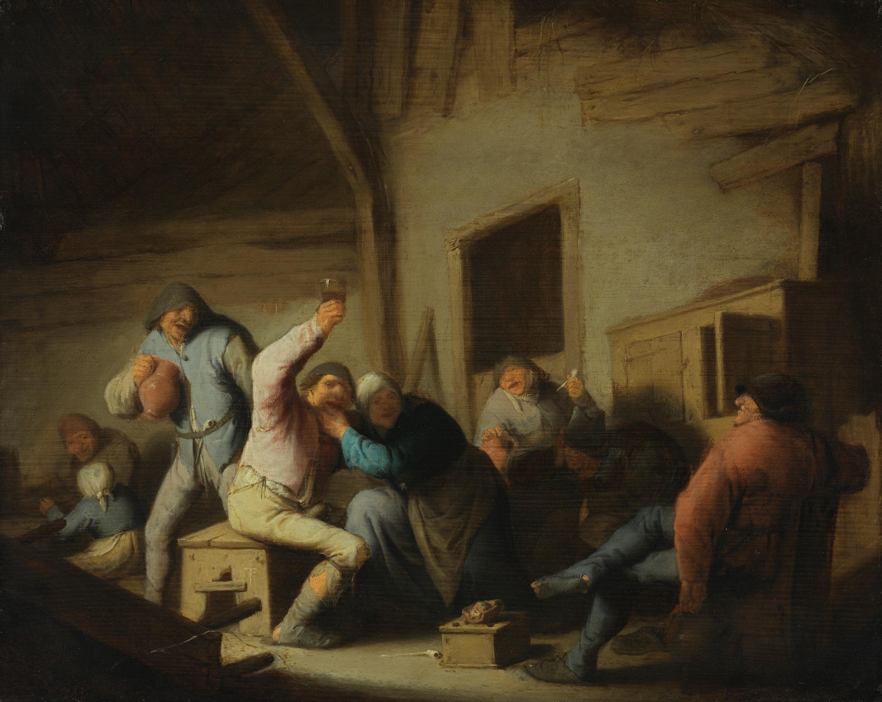 Szenen raufender, fröhlich trinkender, ausgelassener Bauern (siehe auch Inv. Nr. 133) dienten einerseits als moralische Belehrung und Belustigung des bürgerlichen Publikums und boten dem Maler zugleich die Möglichkeit, das Komische und Anstößige, das Groteske und Bizarre bildlich zu vereinen.