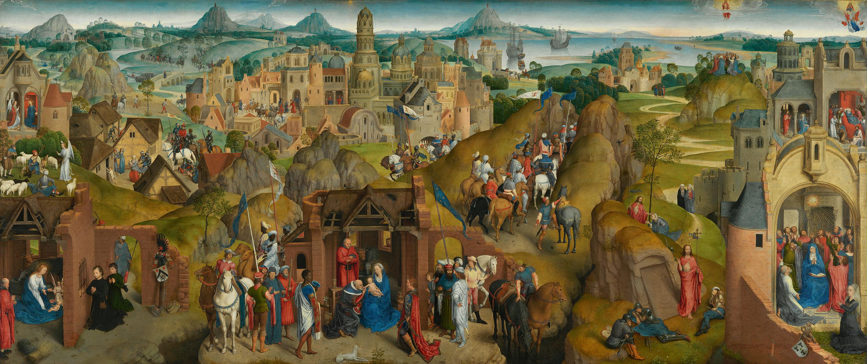 Detailreich wird die Legende der Heiligen Drei Könige geschildert, von der Ausschau nach dem Stern über die Anbetung des Kindes bis zur Rückreise auf dem Seeweg. Darstellungen aus der Geschichte der Gottesmutter und der Geschichte Christi nach der Auferstehung schließen sich links und rechts an. Das Gemälde wurde 1480 von Pieter Bultinc und seiner Frau, Katalijne van Ryebeke, für die Kapelle der Lohgerbergilde in der Frauenkirche zu Brügge gestiftet. Beide sind unten links und rechts zu sehen.
