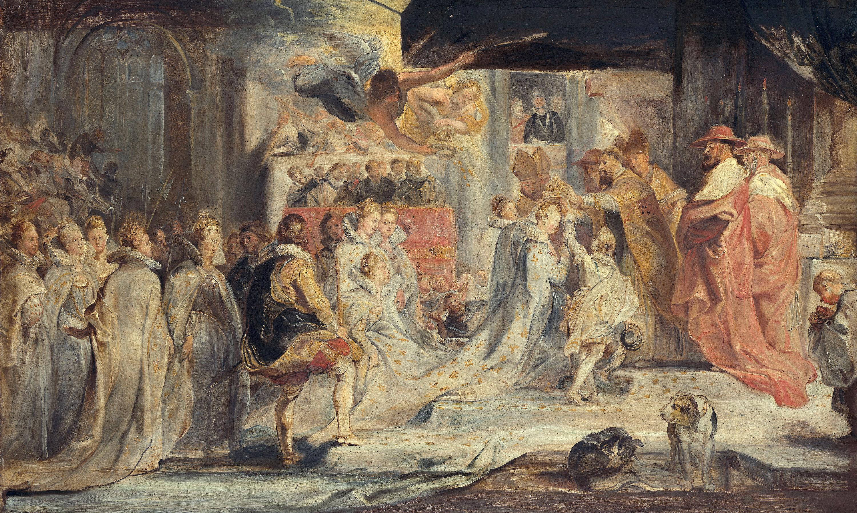 Von der Krönung Maria de’ Medicis in St. Denis versprach sich Heinrich die Festigung der bourbonischen Herrschermacht. Deren Kontinuität wird durch seine Anwesenheit bei der Zeremonie ebenso bezeugt wie durch die von Marguerite von Valois, seiner ersten Frau, die das alte Königsgeschlecht repräsentiert.