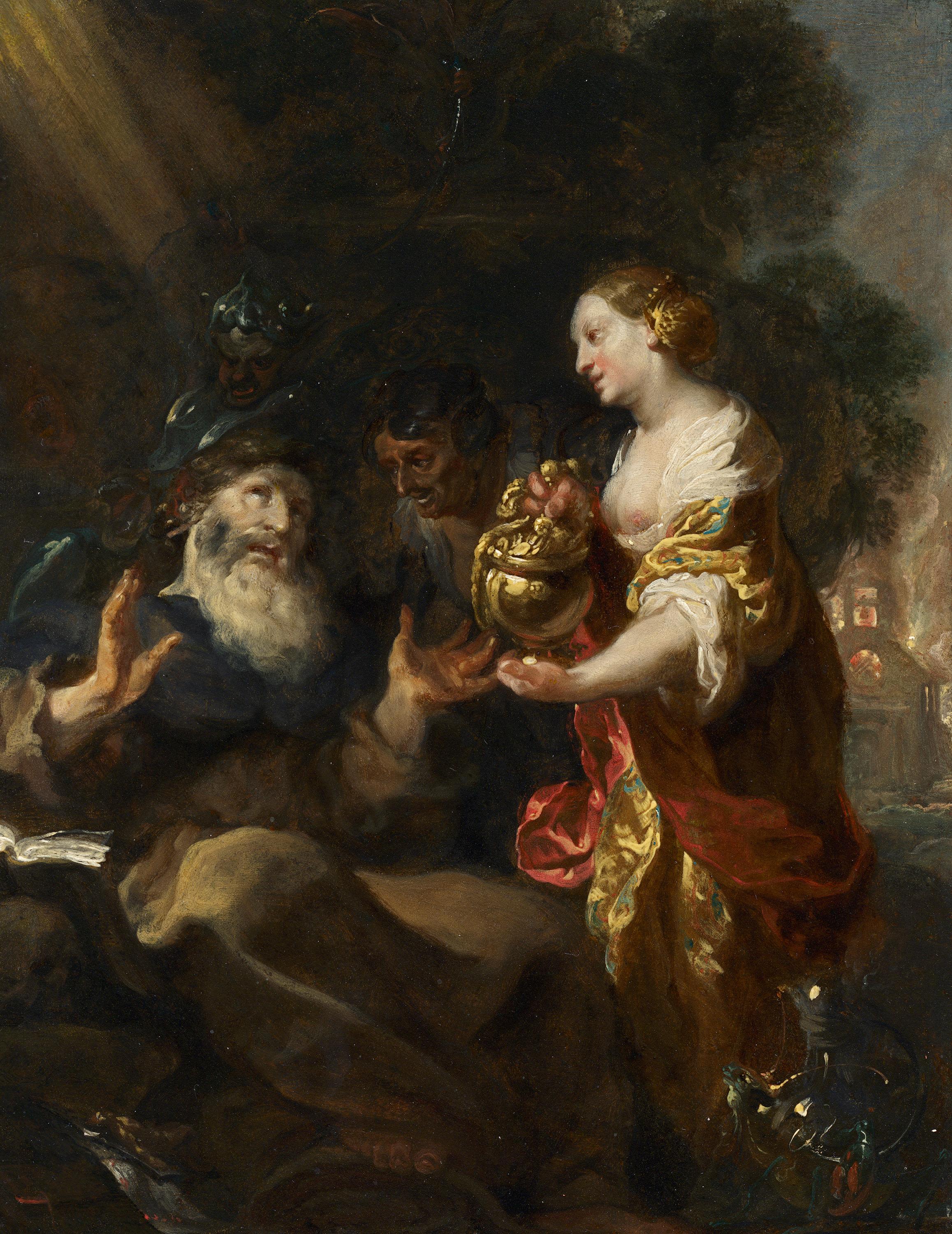 In dieser nächtlichen Szene aus der ›Legenda Aurea‹ wird der Eremit von bösen Geistern geplagt und von einem wollüstigen Weib samt goldenem Kessel in Versuchung gebracht. Mit erhobenen Händen wehrt er die Verlockungen ab, als er von einem erlösenden Strahl Gottes getroffen wird.