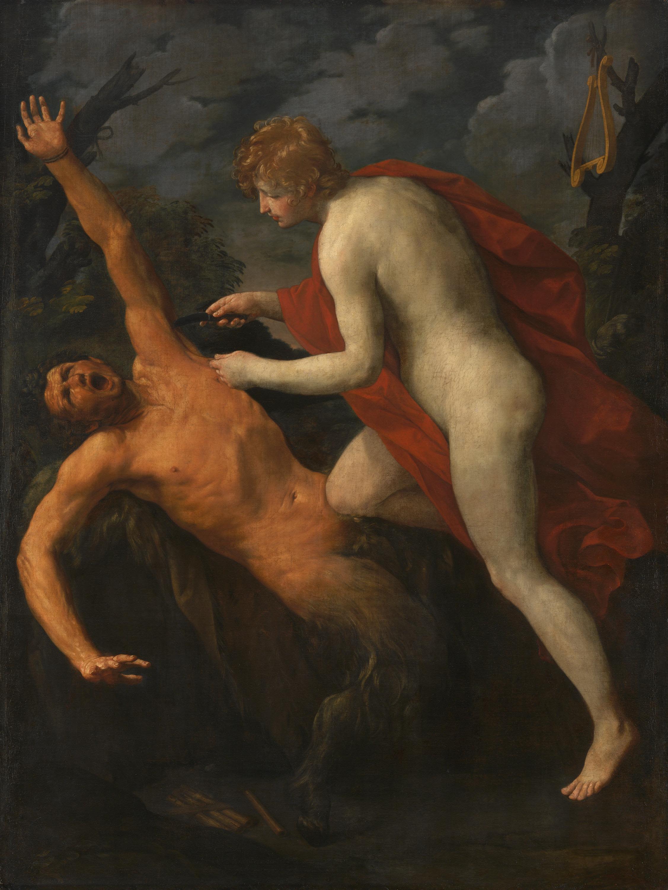Im musikalischen Wettstreit zwischen Apoll und dem Satyr Marsyas, den Ovid überliefert, erklärten die Musen den Gott der Künste zum Sieger. Das Schicksal des Satyrs lag damit in Apolls Händen; er hängte ihn an einen Baum und zog ihm die Haut ab. In der Vollkommenheit einer antiken Statue setzte Reni den Gott in scharfen Kontrast zur Erscheinung des gequälten Naturwesens. So gestaltete er die grausame Szene auch als Plädoyer dafür, dass die Kunst sich nicht dem Vorbild der rohen Natur, sondern dem Ideal klassischer Schönheit verpflichten solle.