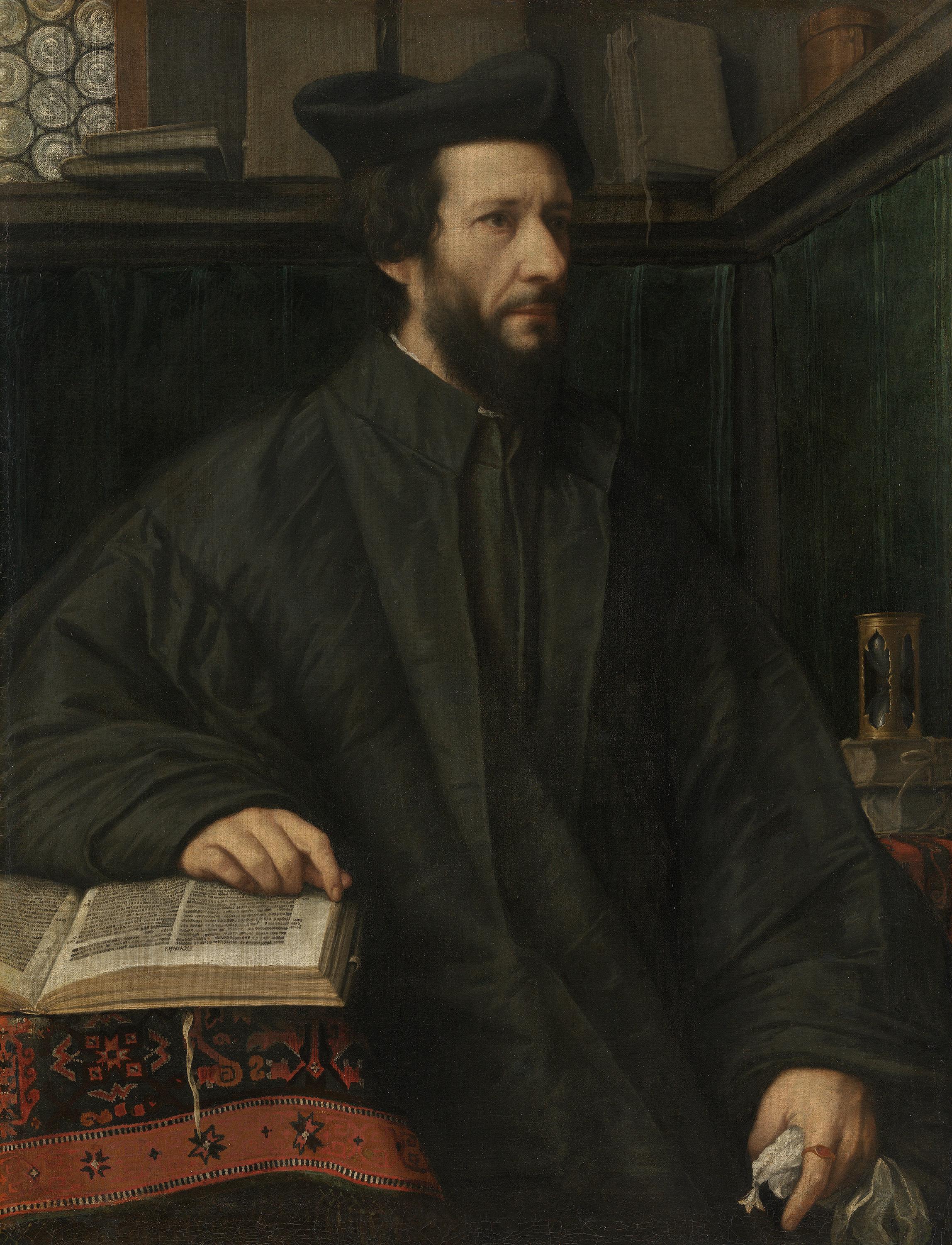 Als führender Maler seiner Heimatstadt Brescia wurde Moretto vor allem als einfühlsamer Porträtist geschätzt. Das schwarze Gewand und das Birett kennzeichnen den Dargestellten als Geistlichen. Vermutlich handelt es sich um den Kleriker und päpstlichen Nuntius Gerolamo Martinengo Cesaresco. Moretto zeigt ihn umgeben von Büchern in einem studiolo und stellt das Bildnis somit in die Darstellungstradition des heiligen Hieronymus im Gehäuse. Die Überschrift des aufgeschlagenen Buches ›Homilia‹ zeigt an, dass es sich um eine Predigtsammlung handelt.