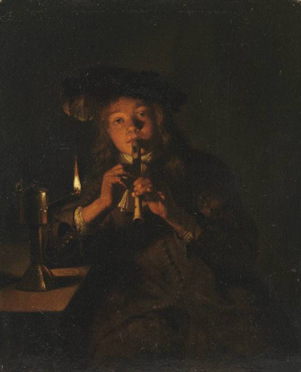 Caspar Netscher, Flöteblasender Knabe im Schein einer Öllampe, 1664/65, Bayerische Staatsgemäldesammlungen – Alte Pinakothek, URL: