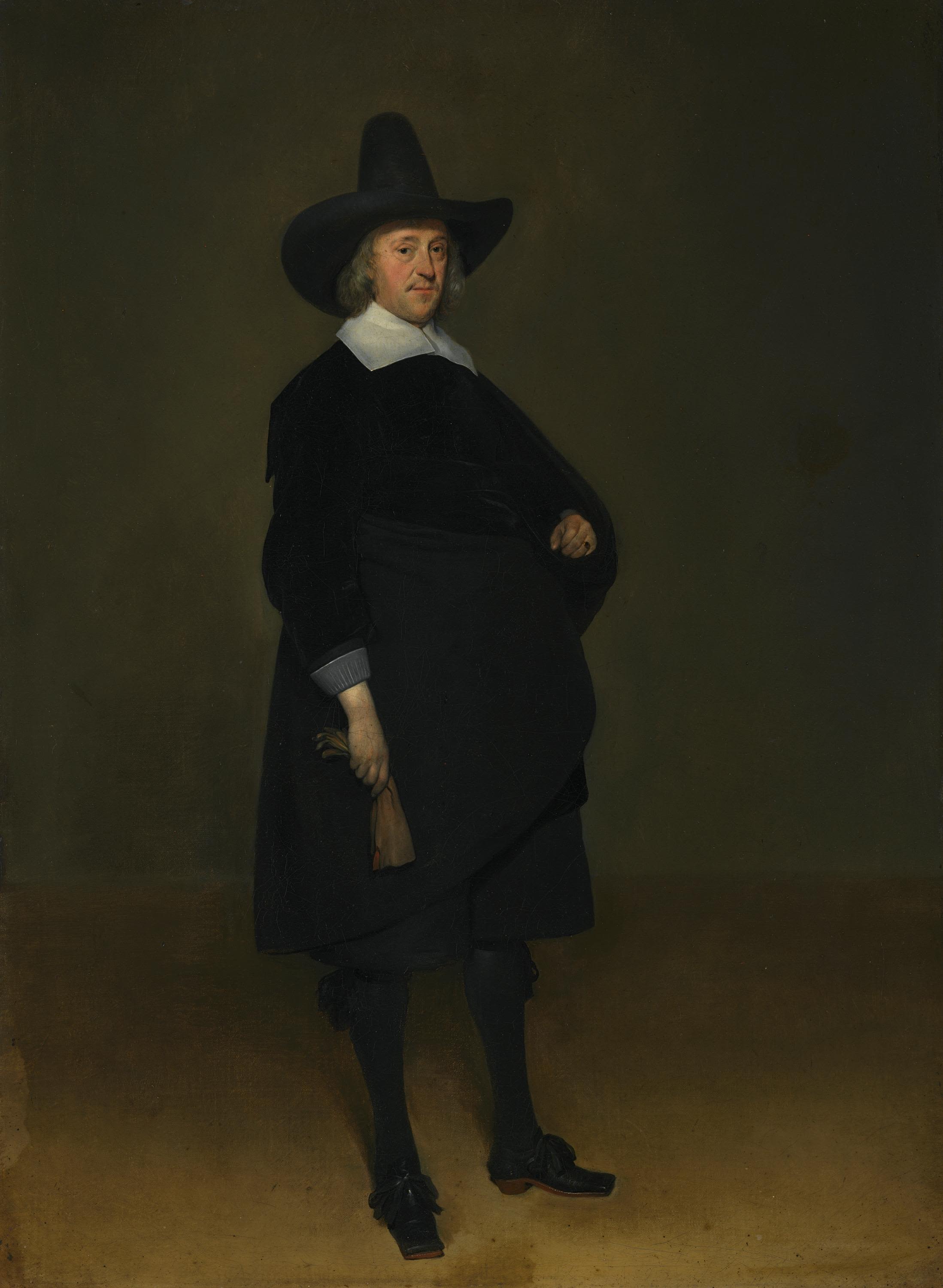 Inspired by full-length pictures of the aristocracy, Ter Borch, who was active in Deventer, introduced a new genre of painting with these small-format portraits of patricians (see inv. no. 8129), dressed as befitted their rank and set against a neutral background, which reflect the self-assurance of the elite in the Netherlands.