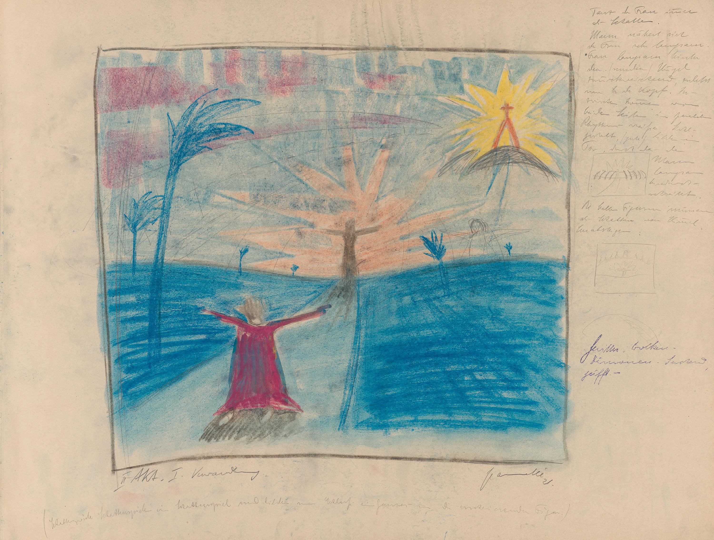 9/20: schwarze Kreide, Aquarell, Tempera, Pastell;