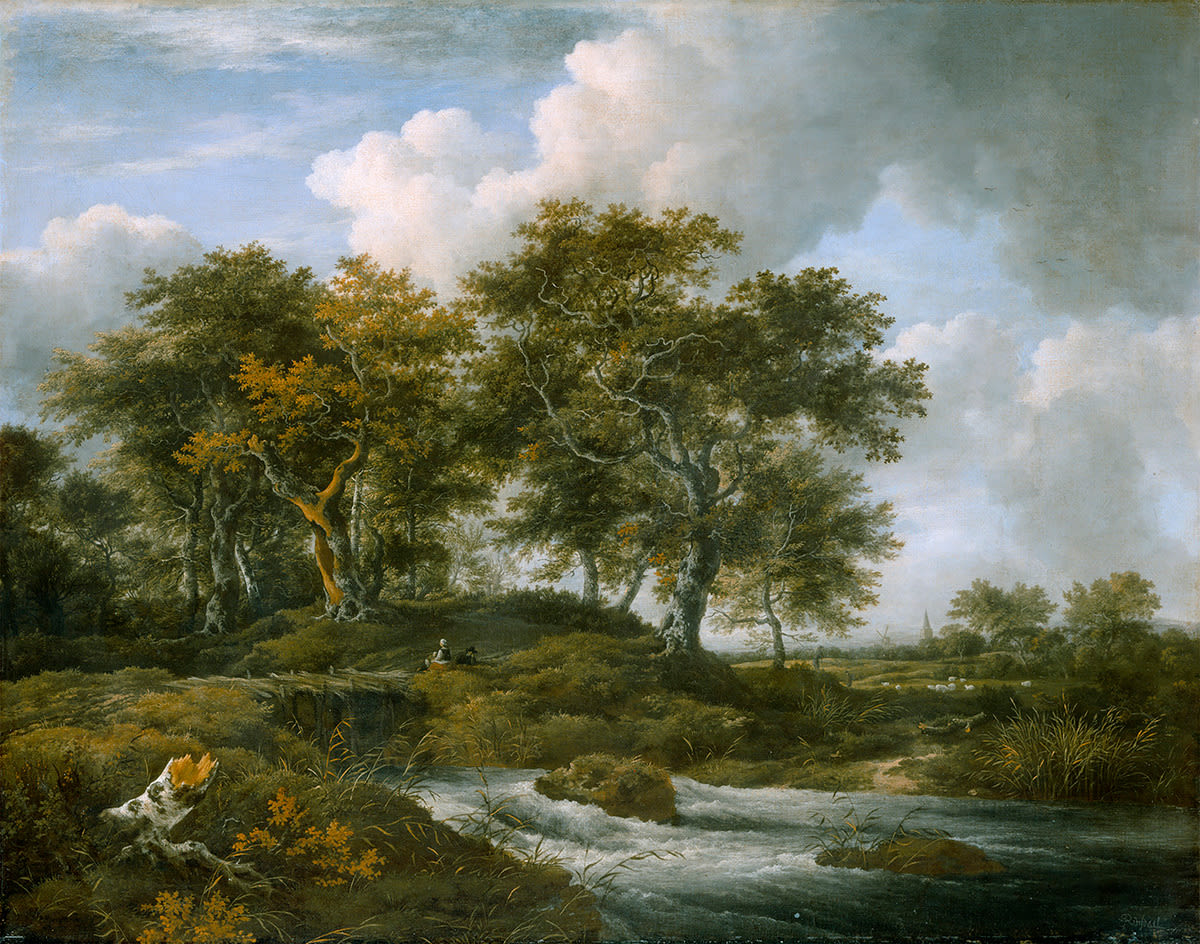 At the foot of a forest slope, near a wooden bridge over a rushing stream, a family rests by the side of a path. The idealised, harmonious composition continues a Haarlem pictorial tradition that deemed impressions of local landscapes worthy of depiction.