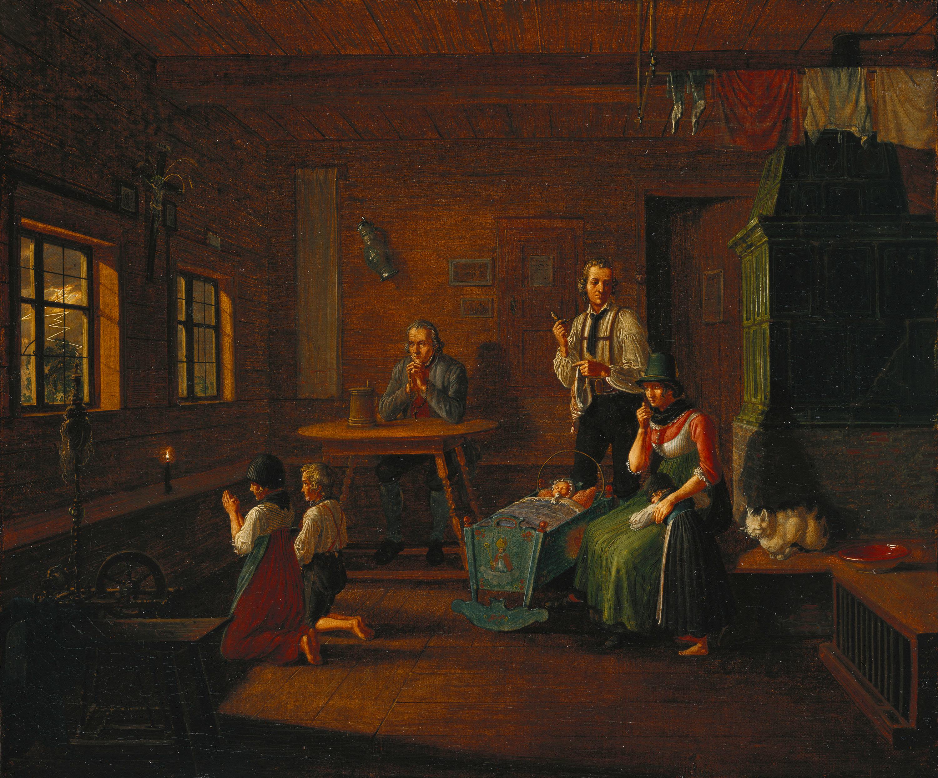 Lorenzo Quaglio, Bauernfamilie in der Stube bei einem Gewitter, um 1833, Bayerische Staatsgemäldesammlungen – Neue Pinakothek, URL: https://www.sammlung.pinakothek.de/en/artwork/5RGQa3vGz3 (Last updated on 10.10.2025)