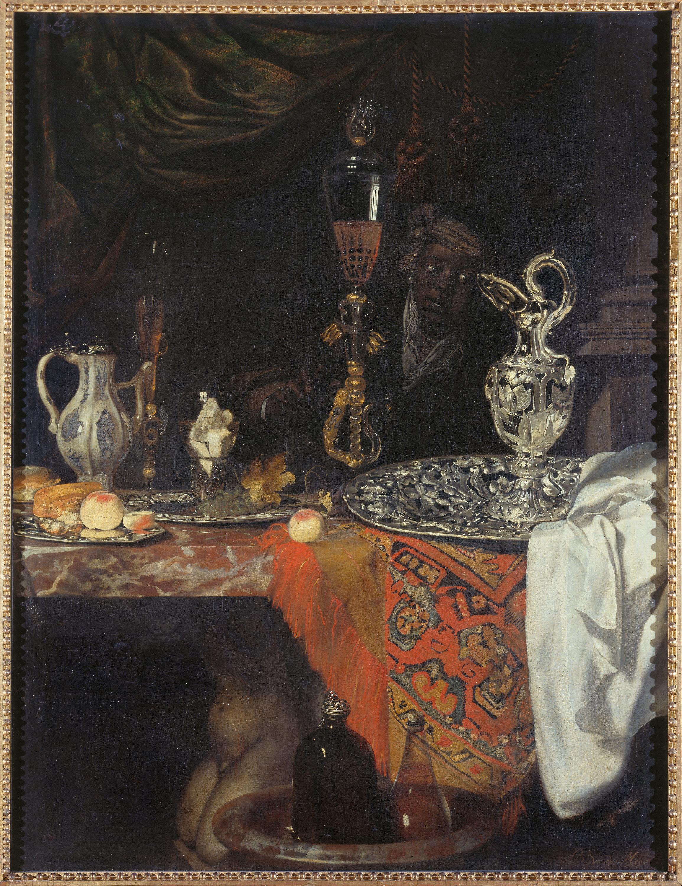 On a heavy reddish brown marble tabletop supported by an Atlas figure and partially covered by an oriental carpet, exquisite silversmith work, finest drinking glasses, exotic fruits, precious white bread, and a porcelain jug with a silver lid are lavishly put on display. This octagonal shaped jug is a wine carafe of the type produced in underglaze blue technique, mostly on commission from the Dutch East India Trading Company in China, while its silver lid is a later addition made in Europe.