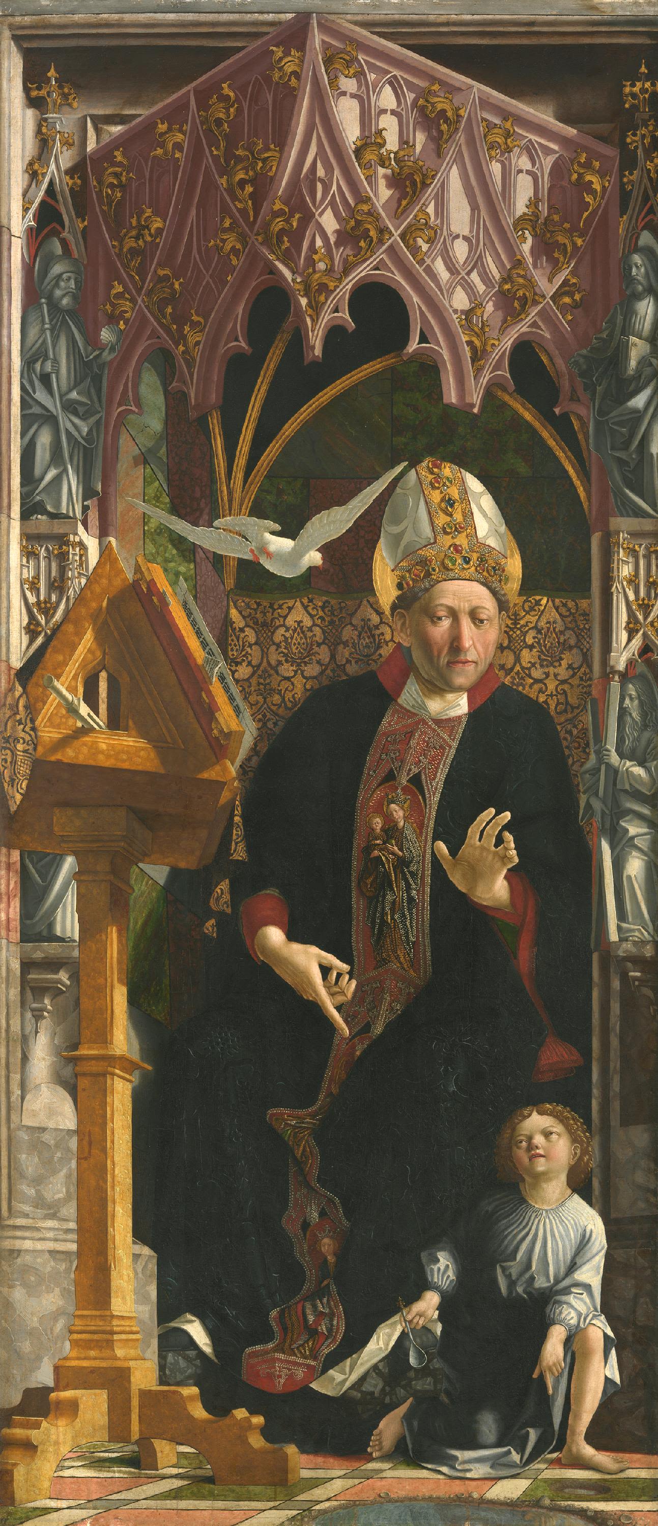 The altarpiece of the Early Church Fathers from the Church the Augustinian Canons at Neustift near Brixen (see inv. no. 2598, 2599, 2600) shows the four most important scholars of the Western Church with their legend-related attributes: Jerome with the lion, from whose paw he is extracting a thorn; Augustine with the child who convinced him of the impossibility of fathoming the mystery of the Holy Trinity; Pope Gregory the Great with Emperor Trajan who he redeemed from purgatory through prayer; Ambrose with the child who demanded that he be anointed bishop. Four scenes from the legend of St. Augustine, which once made up the back of the wings, are also part of the altarpiece.
