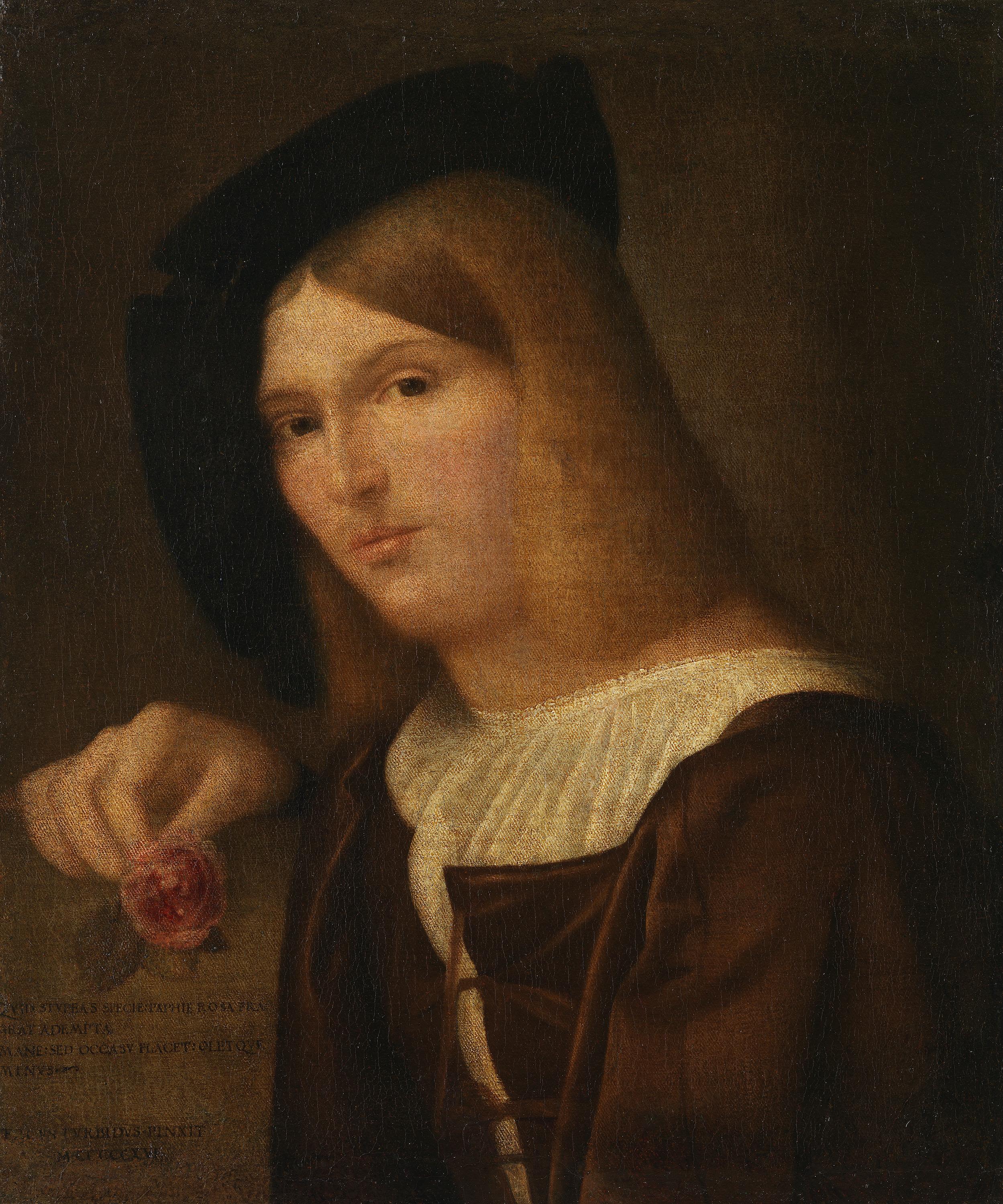 The portrait of this fair-haired youth is closely related to the idealising portraits of young men that were particularly in demand in Venice from the first decade of the 16th century. This image type, sometimes known as the “lyrical portrait”, testifies to a new sensibility on part of both the artists and their patrons, whose often hidden yearnings and dreams were now to find expression in their likenesses just as much as their outward appearance or social status. With such images, the subject’s expression is simultaneously introspective and sensuous, and the emotional impact often ambiguous. Here, the young man playfully grasps a rose with his dainty fingers and casts a seductive glance at the viewer from the corner of his eye. The inscription alludes to the erotic appeal of the depiction and celebrates the power of art by explaining that while a plucked rose is ephemeral, the painted portrait provides a lasting image of beauty.