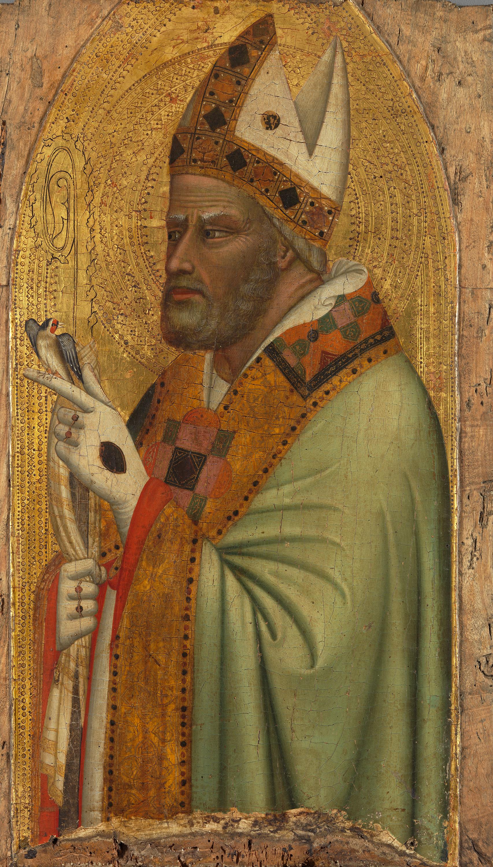 Bernardo Daddi was one of the most successful Florentine masters in the first half of the fourteenth century. The saint, whose robes show he is a bishop, is holding a goldfinch in his left hand. Since the bird is a symbolic reference to the Passion of Christ it can be assumed that the central panel of what was probably a five-part altar showed the Virgin and Child, towards whom the bishop has turned.