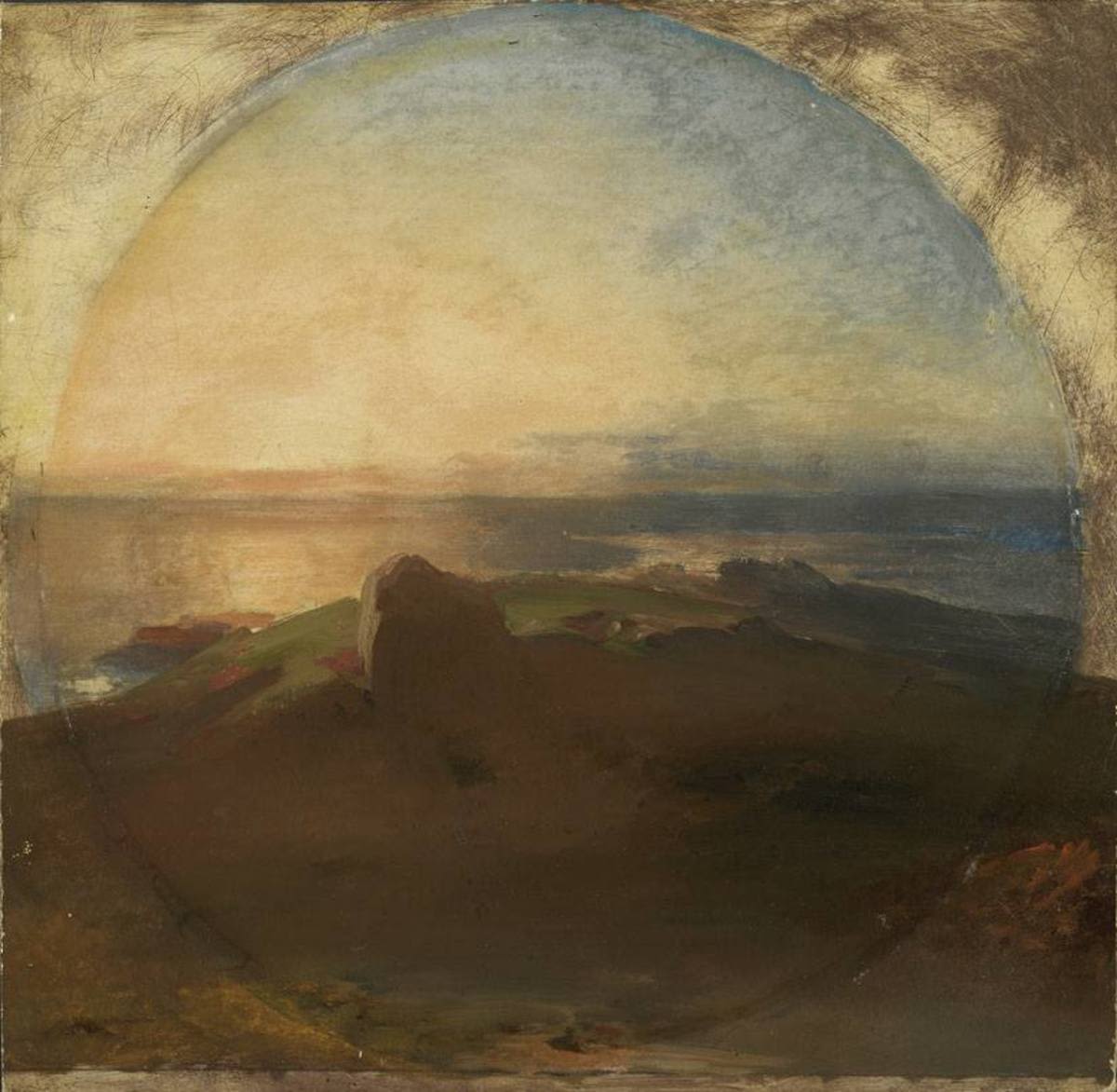 This image, painted on cardboard, shows seaside rocks of the kind Rottmann depicted in a view of the Apollo temple on the island of Aegina and in other pictures. The setting sun floods the landscape with a melancholy glow. The gulf between Greek civilisation of the distant past and the disillusioning reality of the present is almost tangible.