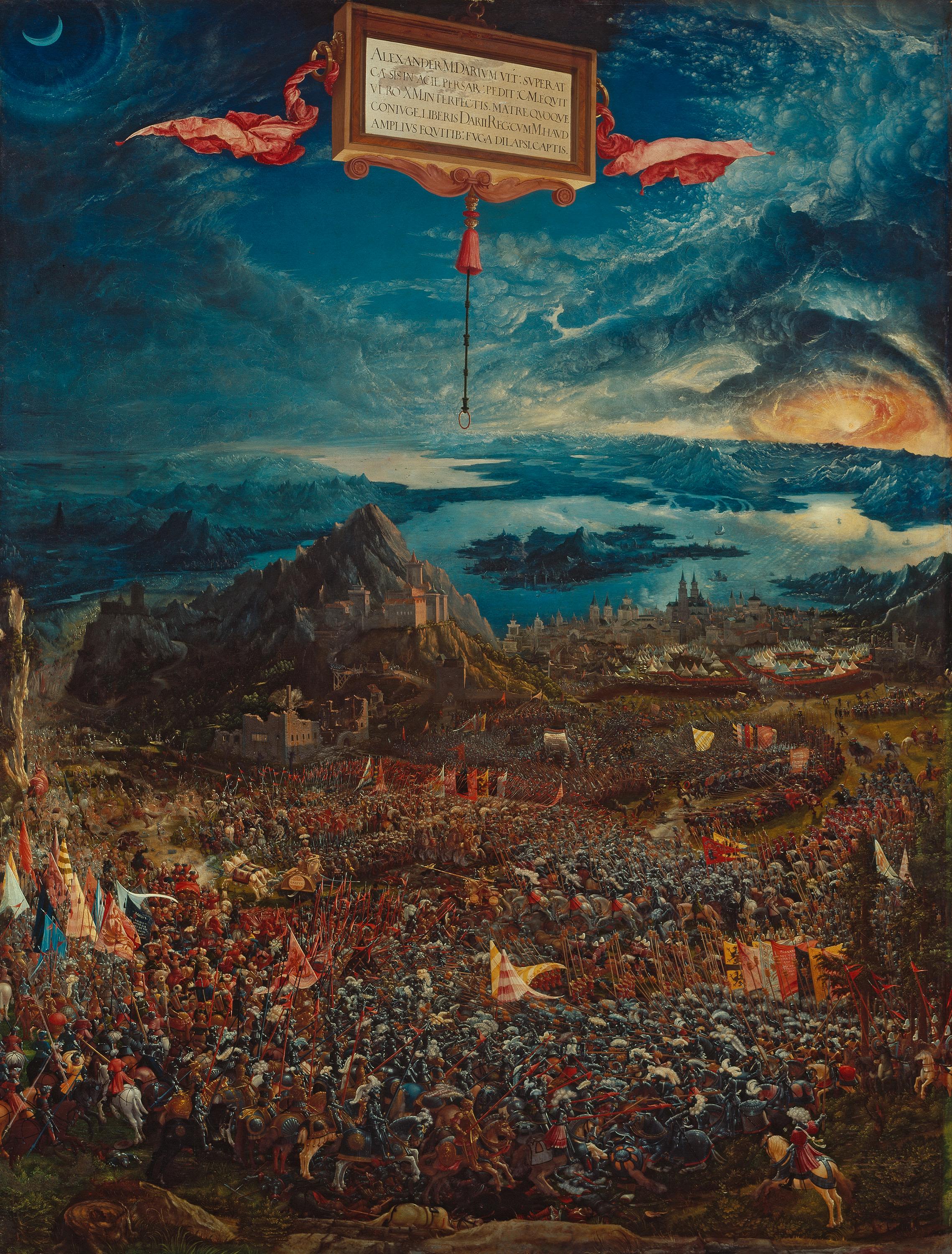 The victory over the King of Persia, Darius III, at Issus in 333 BC helped strengthen Alexander the Great’s position as ruler over the eastern Mediterranean. The painting gives an impression of the extent of this vast empire. Altdorfer orientated his work on the cartographic material of his time. The panel with the Latin inscription that was later altered provides details and the casualties of this battle. The red cord attached draws the eye to the protagonists. The picture is part of a cycle of history paintings that Duke William IV commissioned for the Residence in Munich.