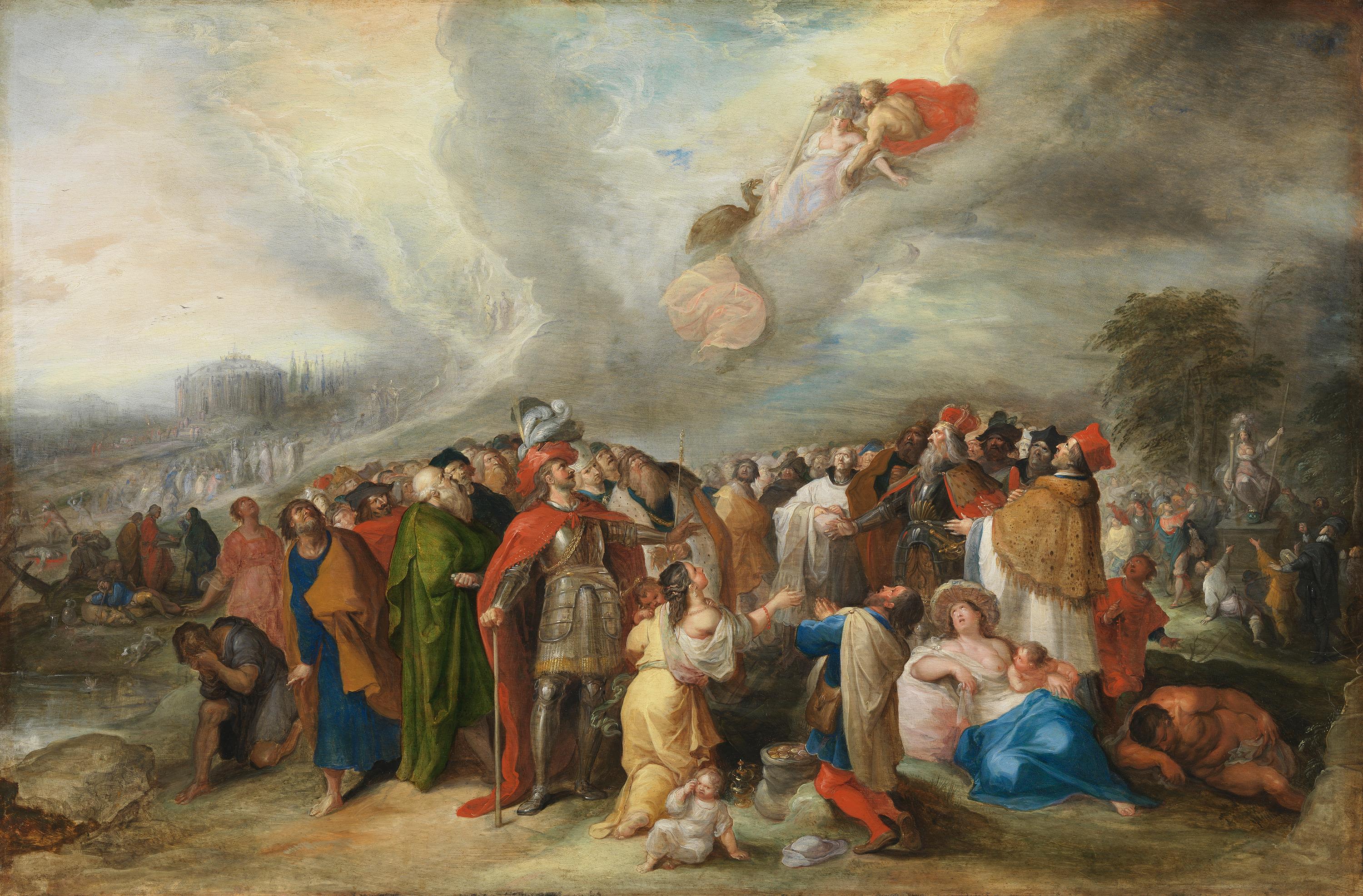 A female figure with bared breasts, plumed helmet, and a sword in hand floats above a large crowd. She is being led by Jupiter, who is accompanied by his attribute, the eagle, to Olympus. She appears twice again in the picture: on the left edge, she is summarily depicted in a group that has gathered in front of a temple and is proceeding up a hill toward an opening in the clouds that is illuminated by a bright light. On the right edge, she is enthroned on a pedestal as a monument with a long staff and an orb under her right foot. Here, too, she is surrounded by people; this group is