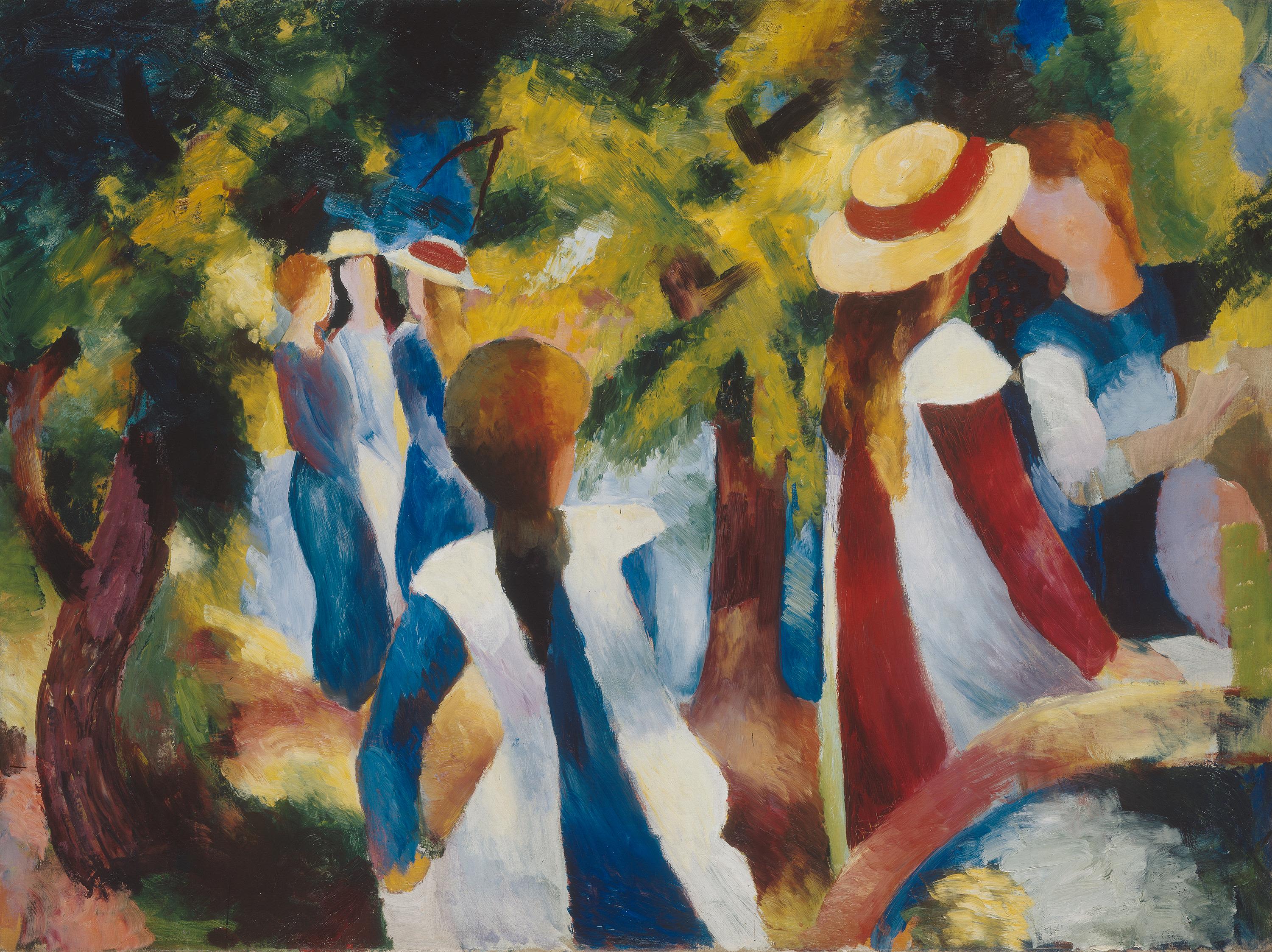 August Macke, Mädchen unter Bäumen, 1914, Bayerische Staatsgemäldesammlungen – Pinakothek der Moderne, URL: https://www.sammlung.pinakothek.de/en/artwork/ApL8peQLN2 (Last updated on 10.10.2025)