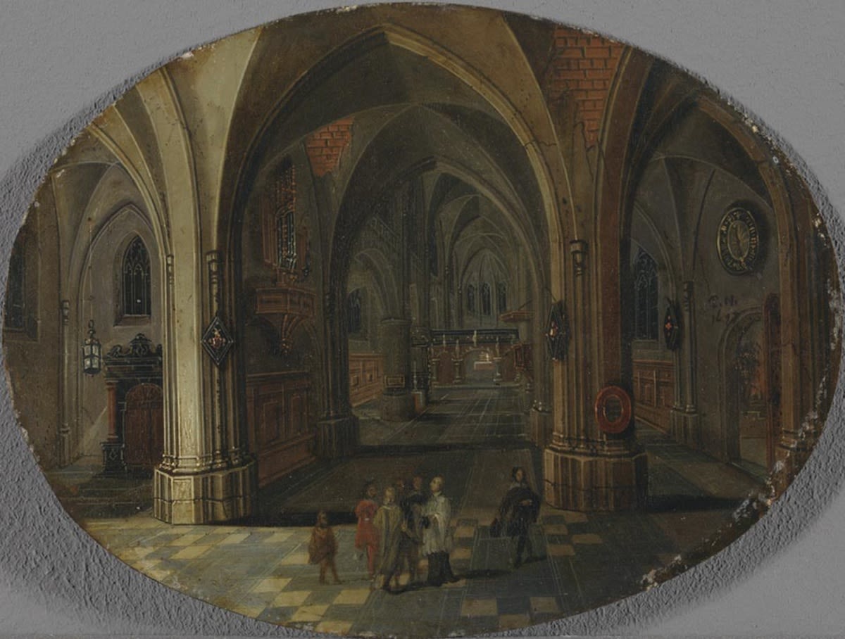 Pieter Neeffs d. Ä., Nächtliche Besucher mit Geistlichem in einer gotischen Kirche, um 1657, Staatsgalerie im Schloss Johannisburg, URL:
