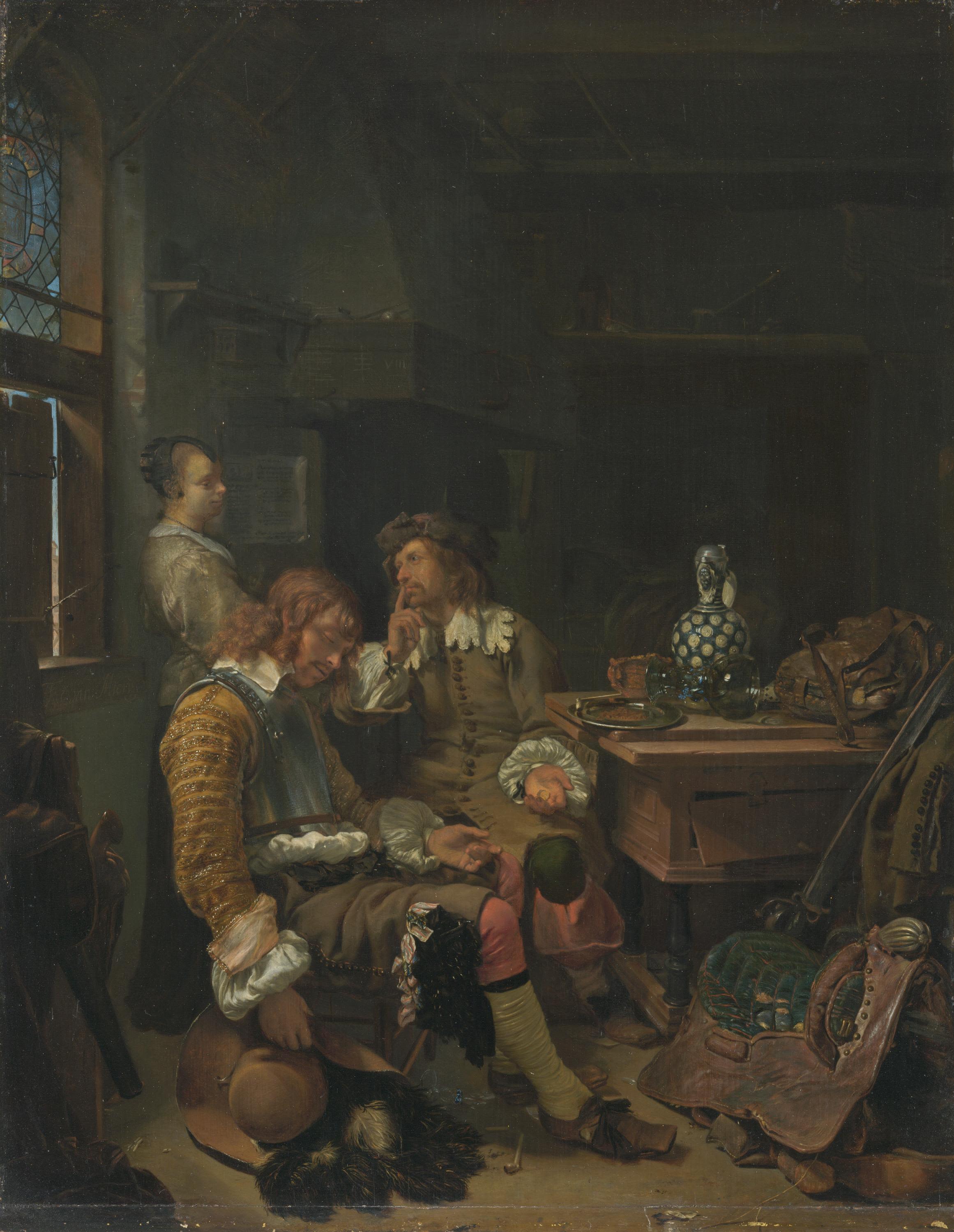 Lazy, good-for-nothing characters sleeping at untimely moments because they are drunk and neglecting their duties are frequently found in Dutch art, forming a motif that goes back to the medieval allegory of the deadly sin Acedia (Idleness), here personified by the officer who is merry from too much wine.
